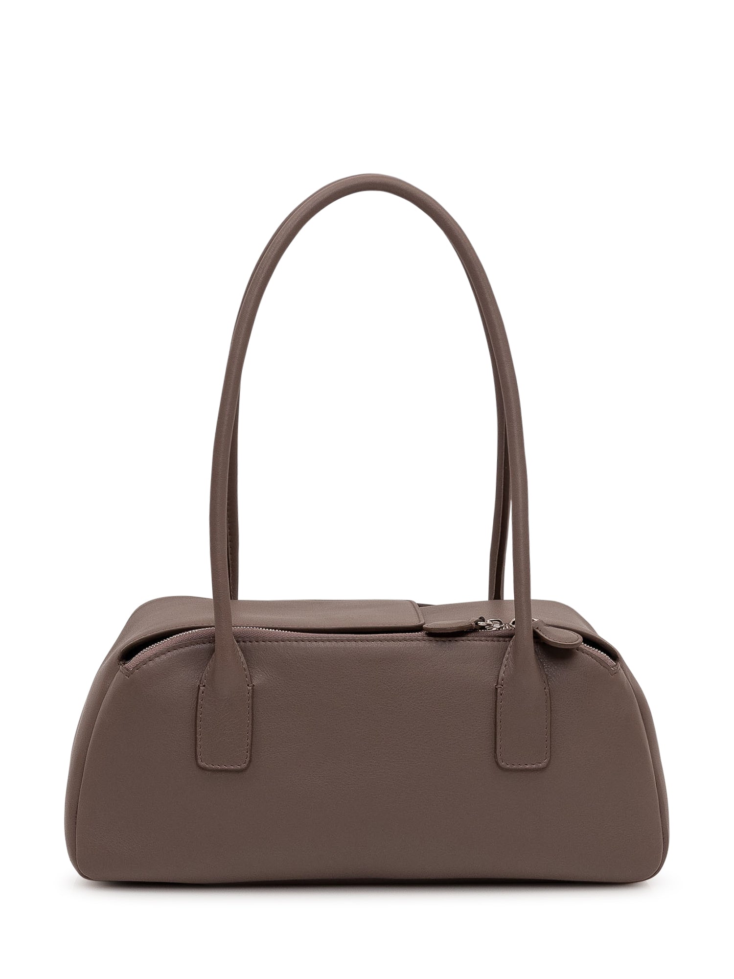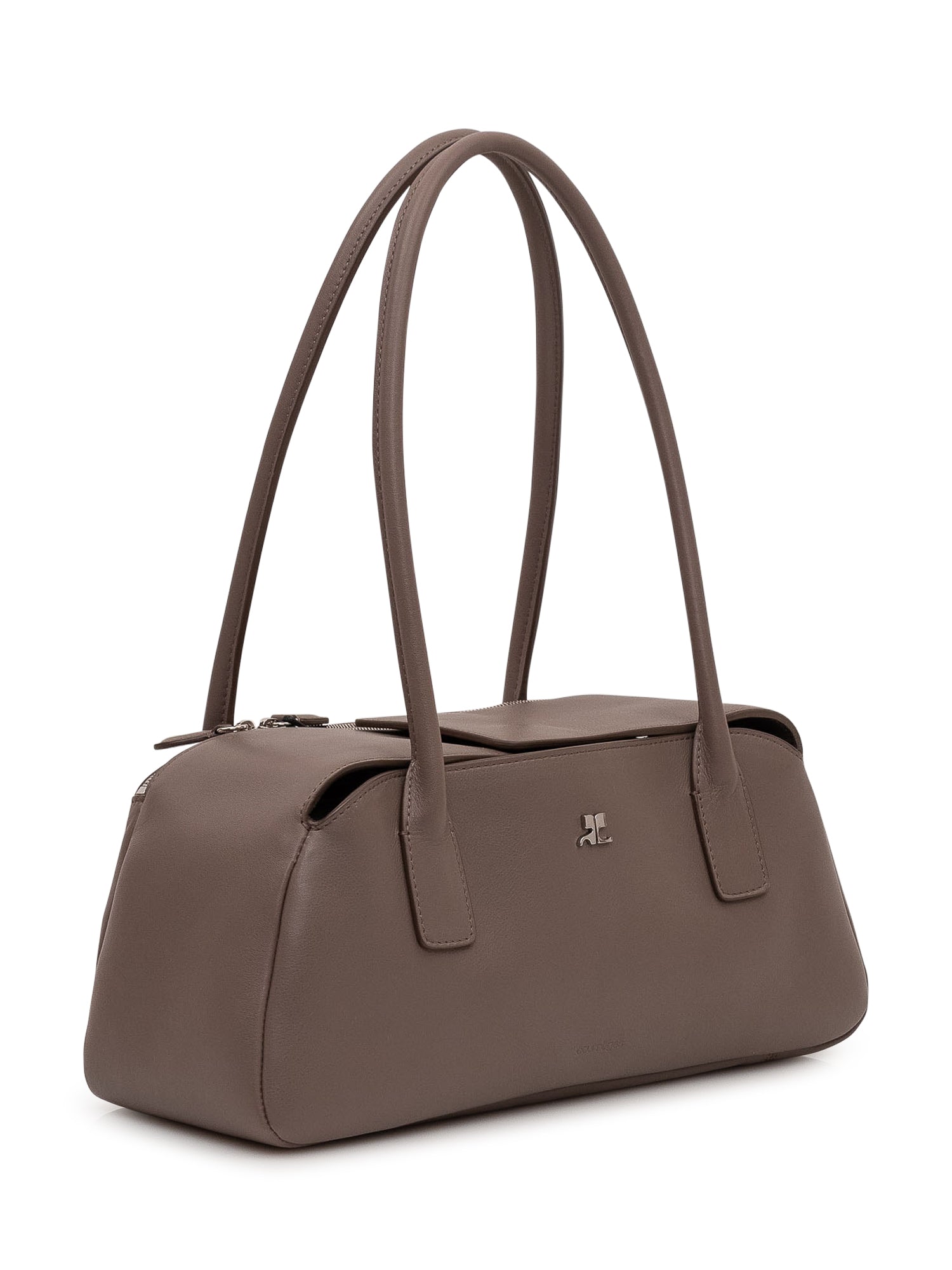 Leather handbag with structured silhouette, double long handles and top zip closure. Logo detail on the front and compact design with rounded lines.