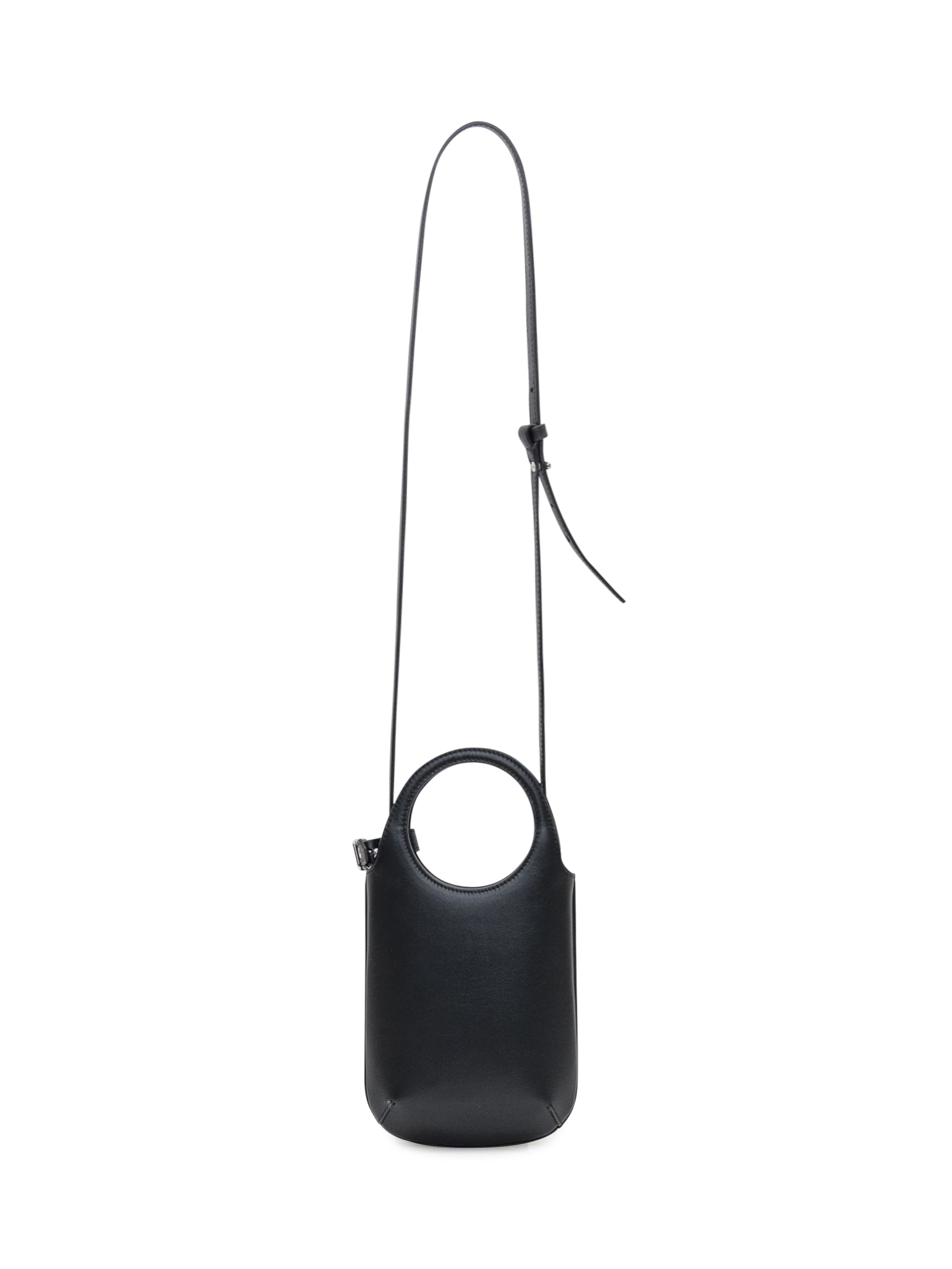 Compact black bag in leather. Characterized by a minimalist and linear design. Adjustable and removable shoulder strap.