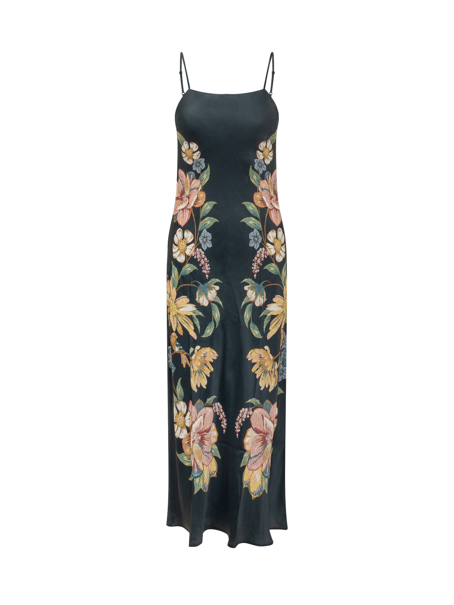Long dress with thin straps and rounded neckline. Design with decorative floral pattern on the front and skirt. Fluid silhouette with fitted shape suitable for elegant looks.