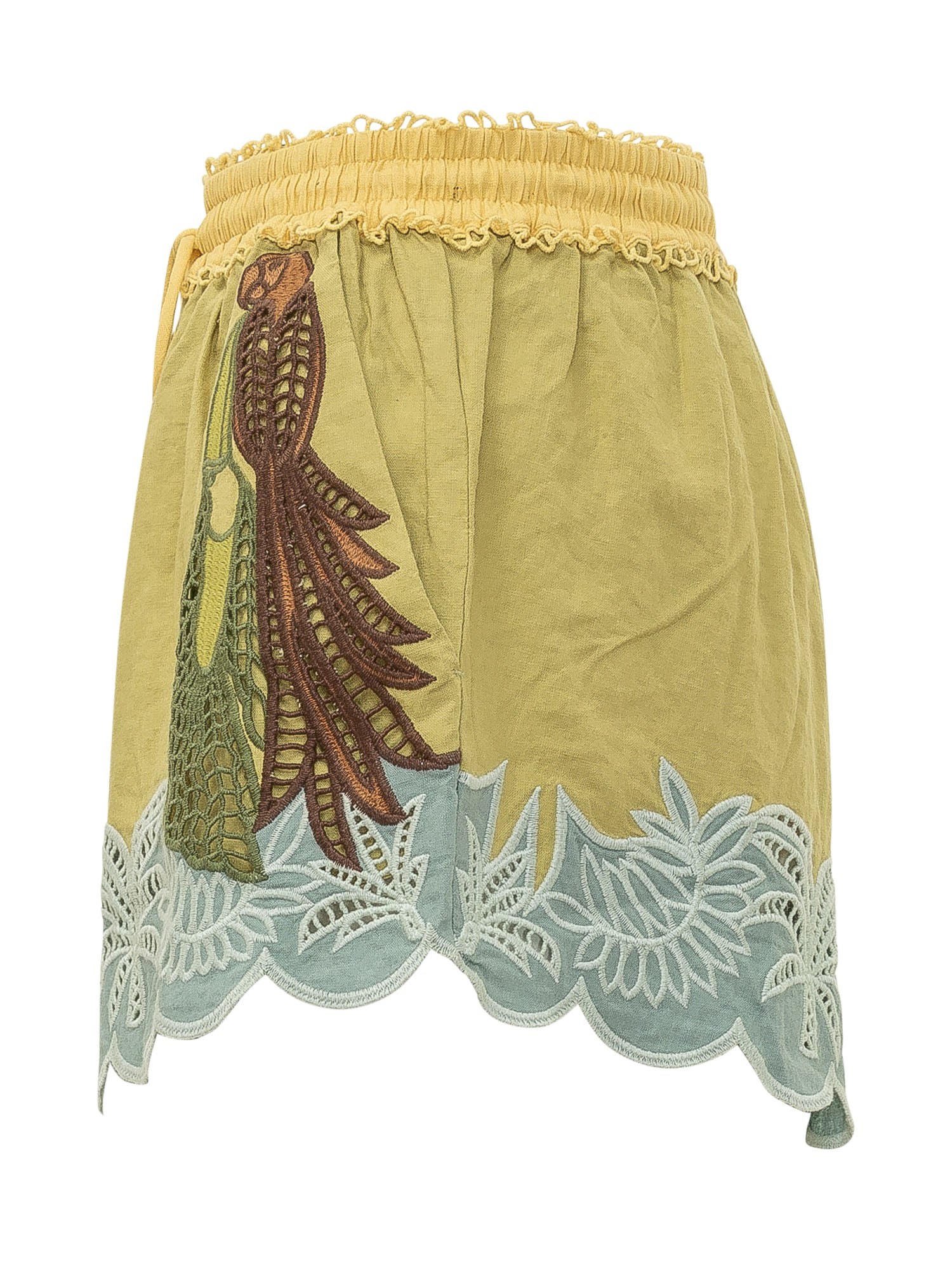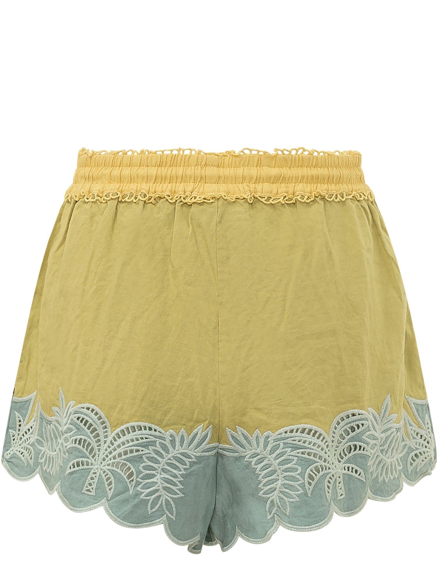 Shorts with elasticated waistband and drawstring, decorative side embroidery and scalloped hem