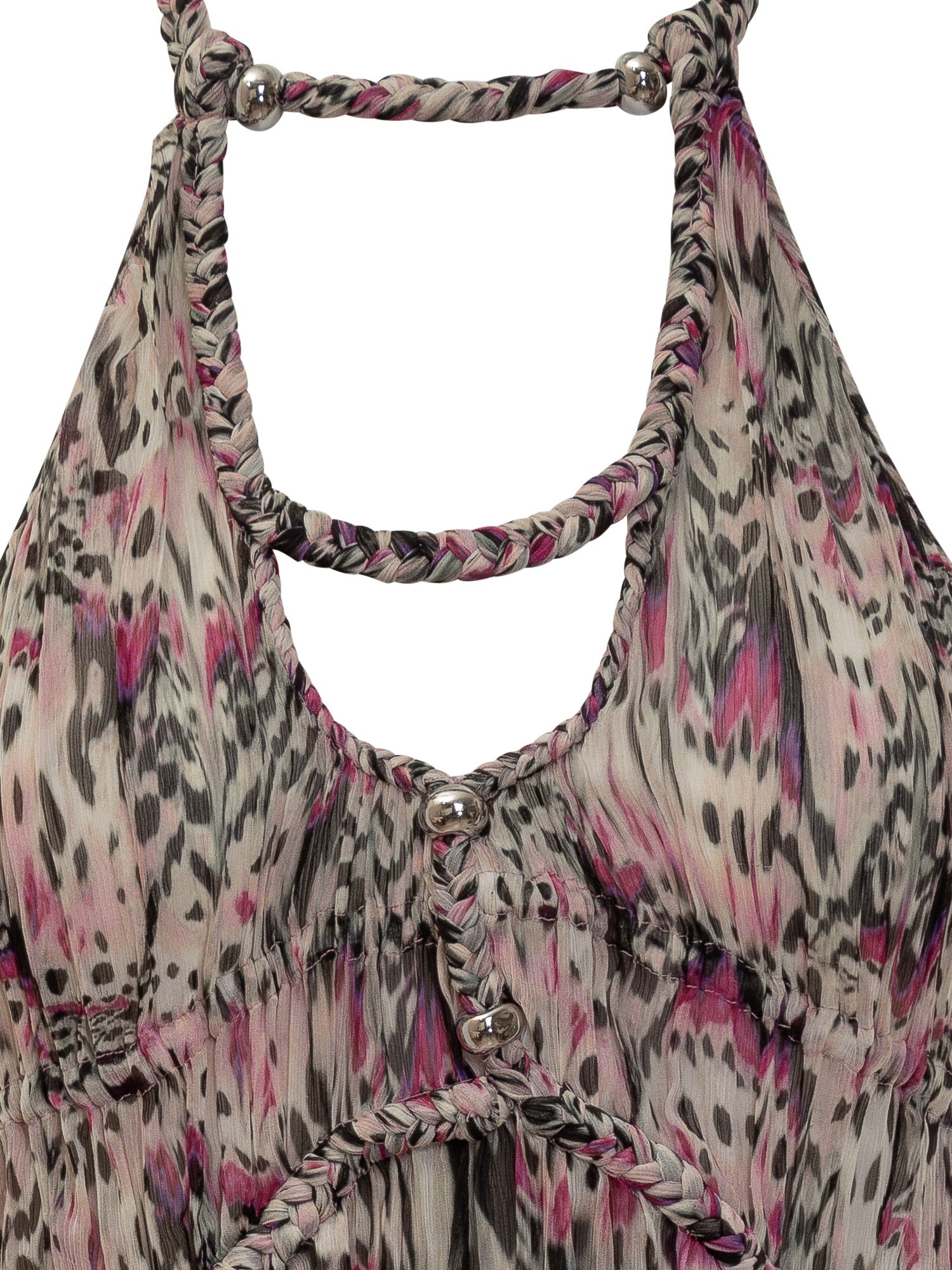 Gown with open back in printed ruched silk. Braided silk shoulder straps. Plunging neckline. Openwork in front. Ruffles in front and back. Matching silk woven trim. Gold metal beading. Button closure at neck and at back with snaps. Flowing gathered and flared skirt. Short cut.