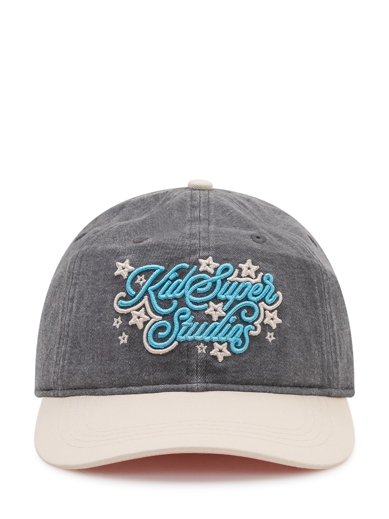Baseball cap with curved visor, stitched panels, front embroidery with lettering and decorative stars