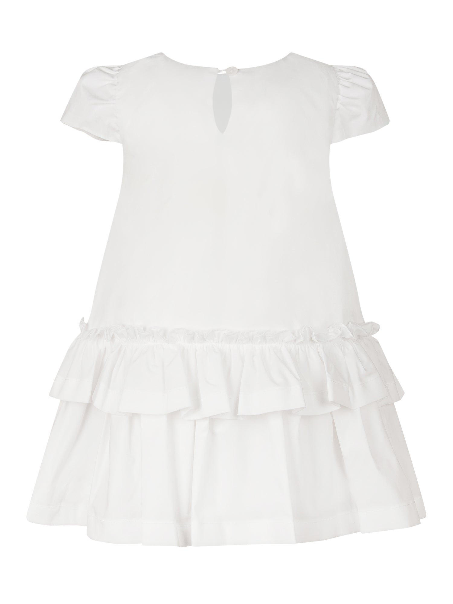 White short dress with ruffles. Half sleeves. Closure with back button.
