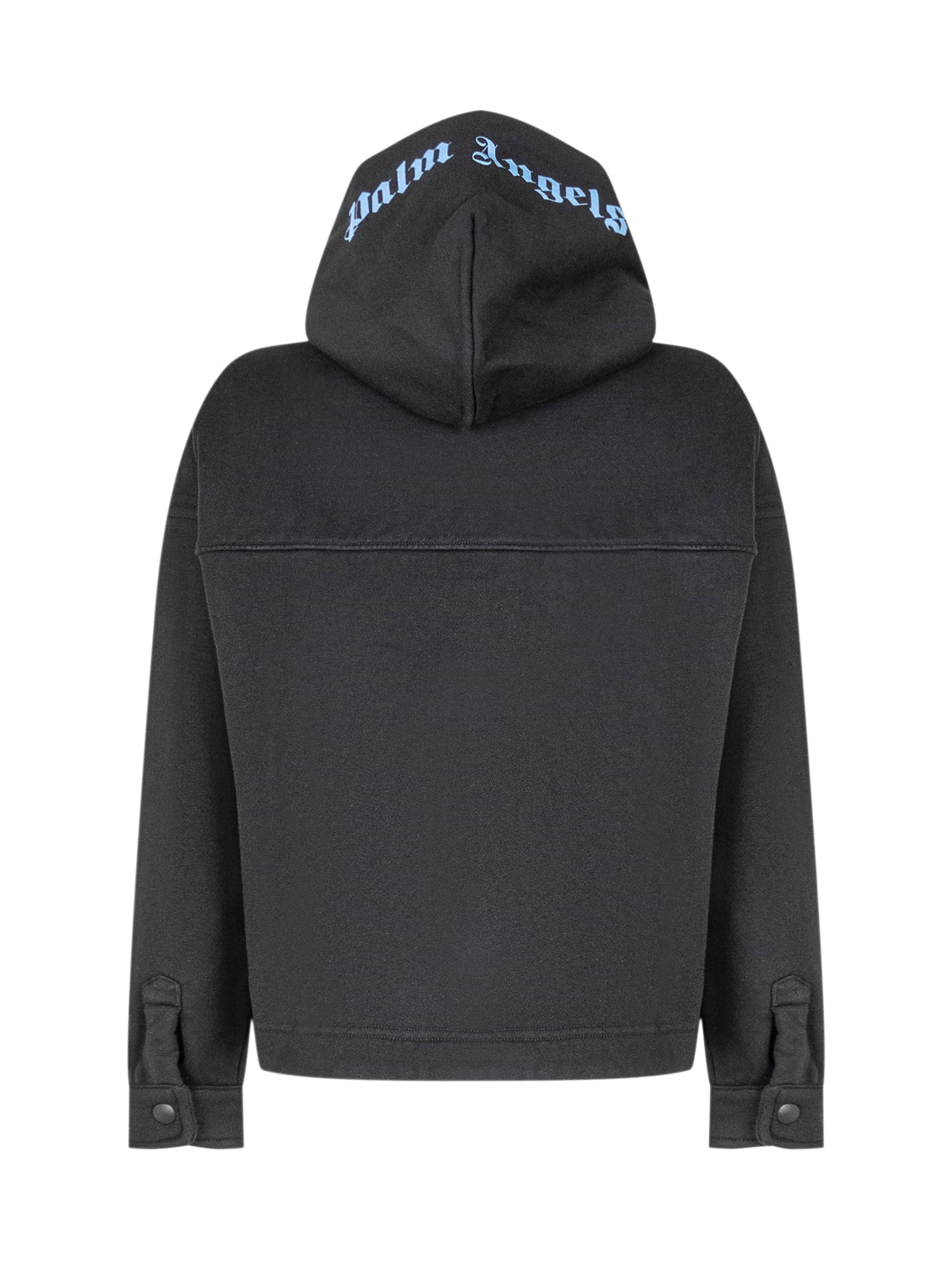 Palm Angels Kids black cotton shirt with fixed hood, snap button closure, and front pocket.