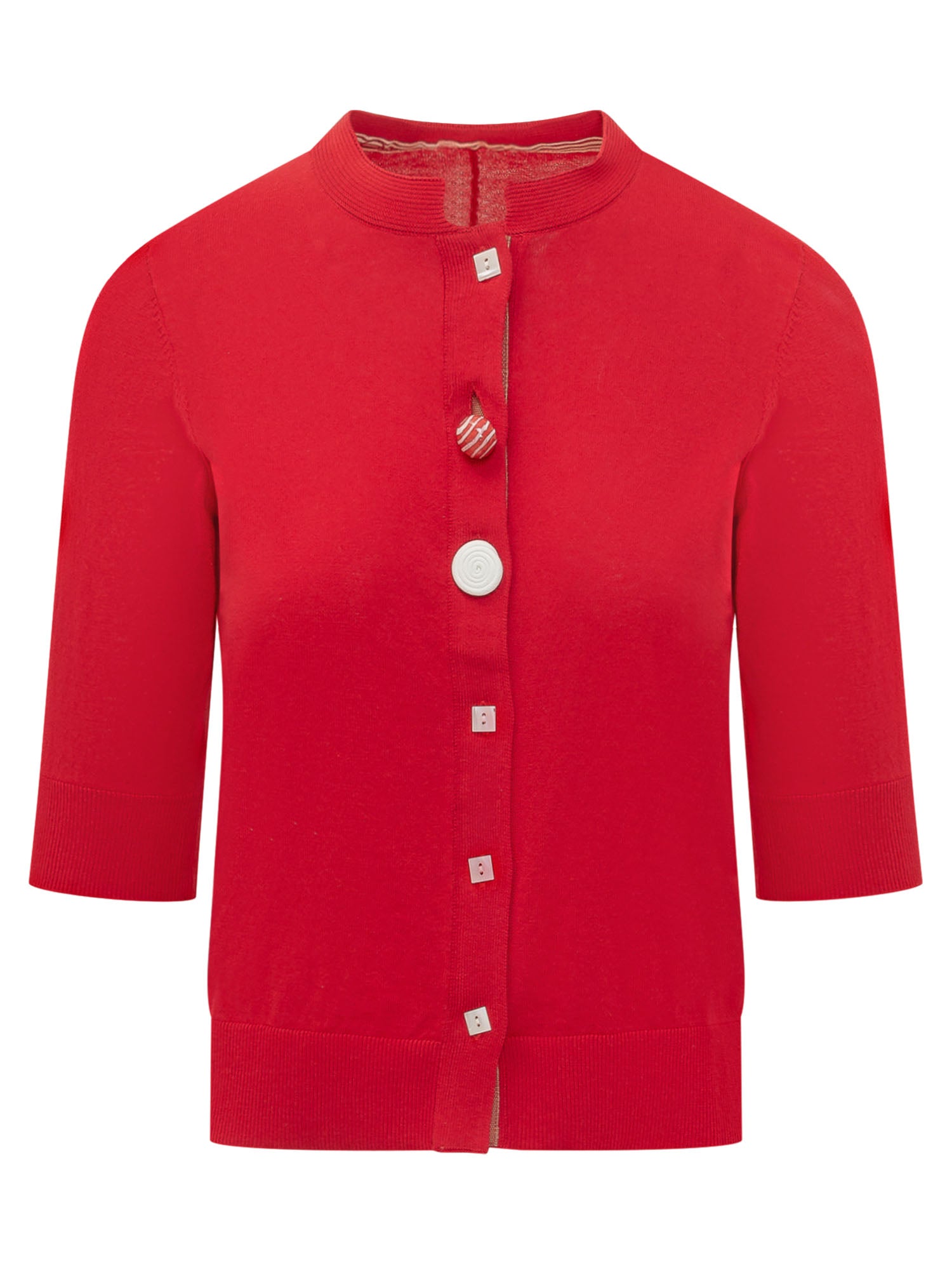 Short-sleeve knit cardigan with decorative buttons and contrast trim details