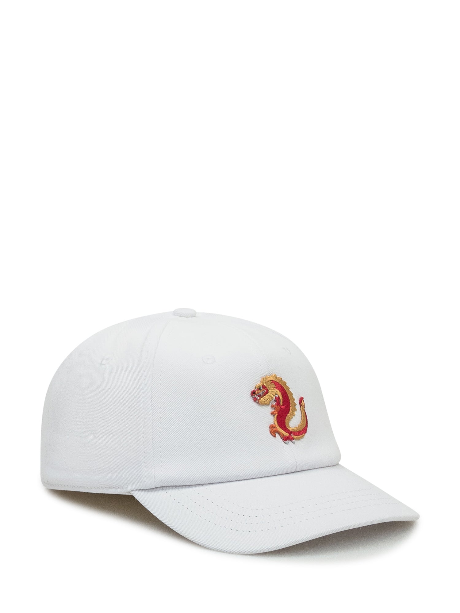 White cotton cap by Alberto Bresci featuring red and gold dragon embroidery on the front.