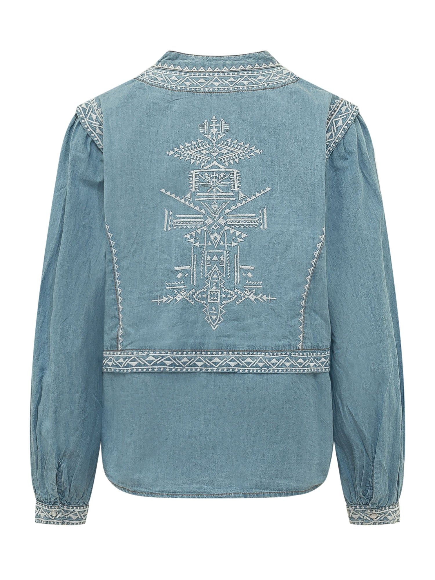 Blouse with long sleeves and geometric embroidery on front and sleeves, open neckline.
