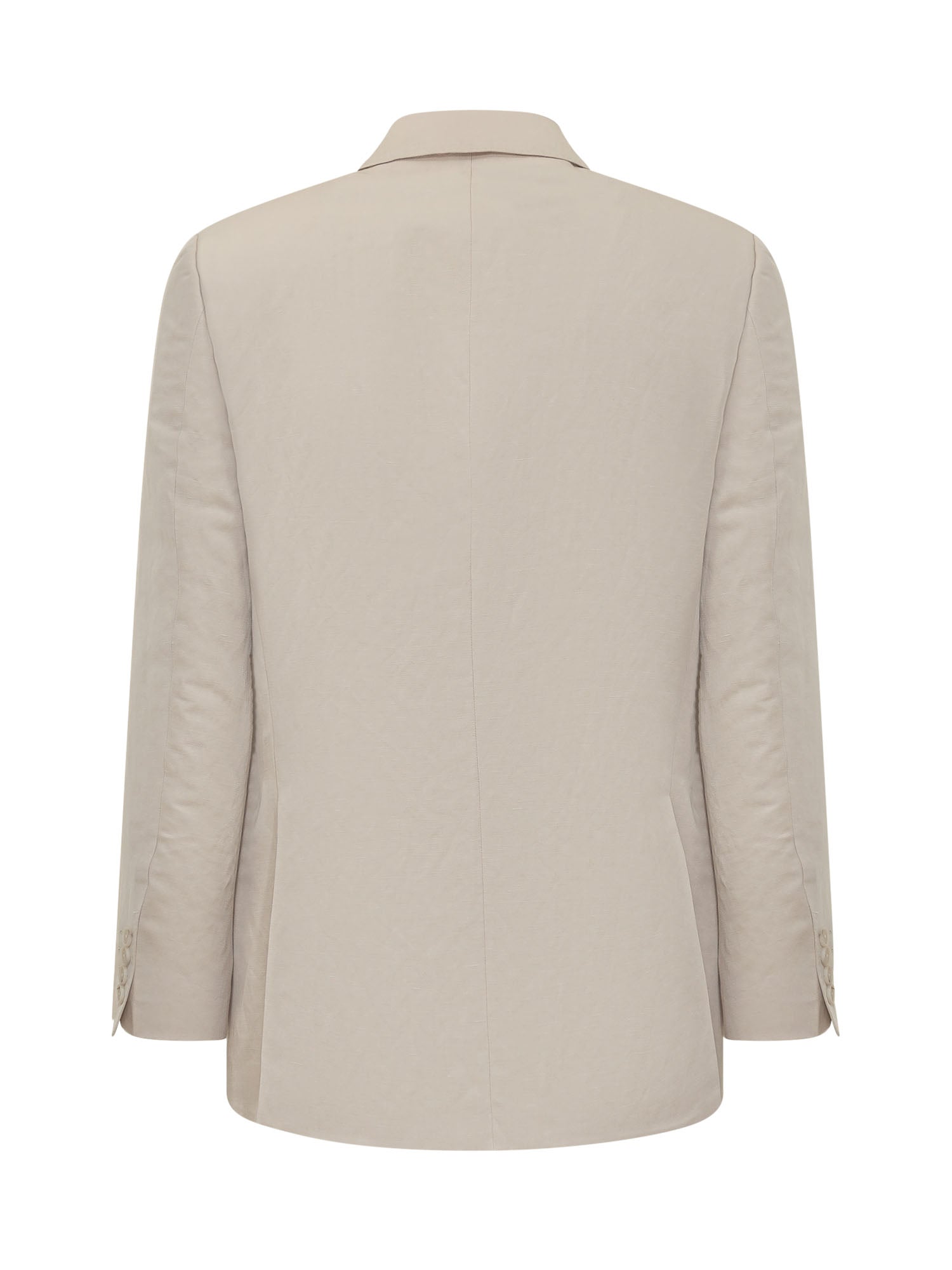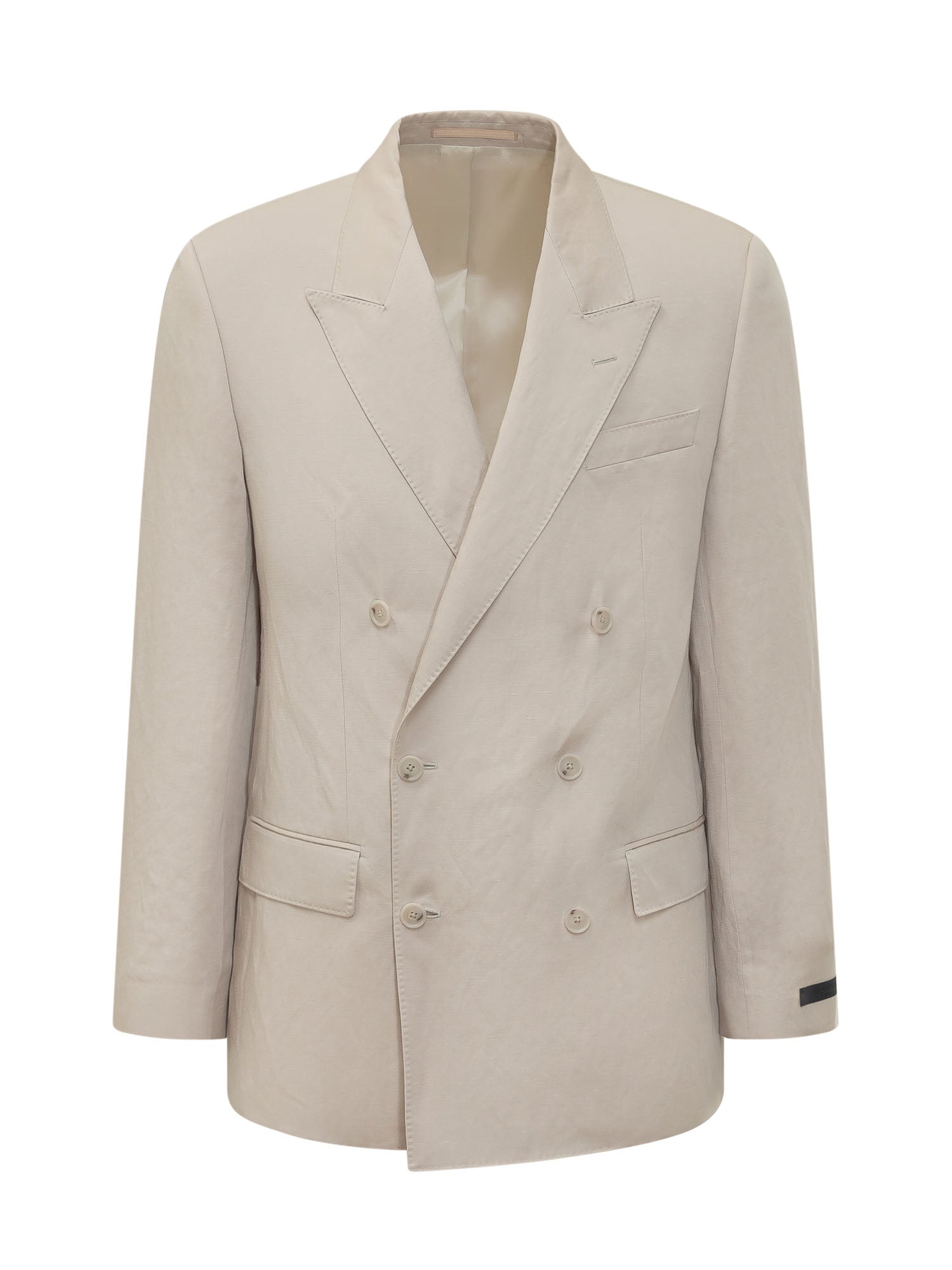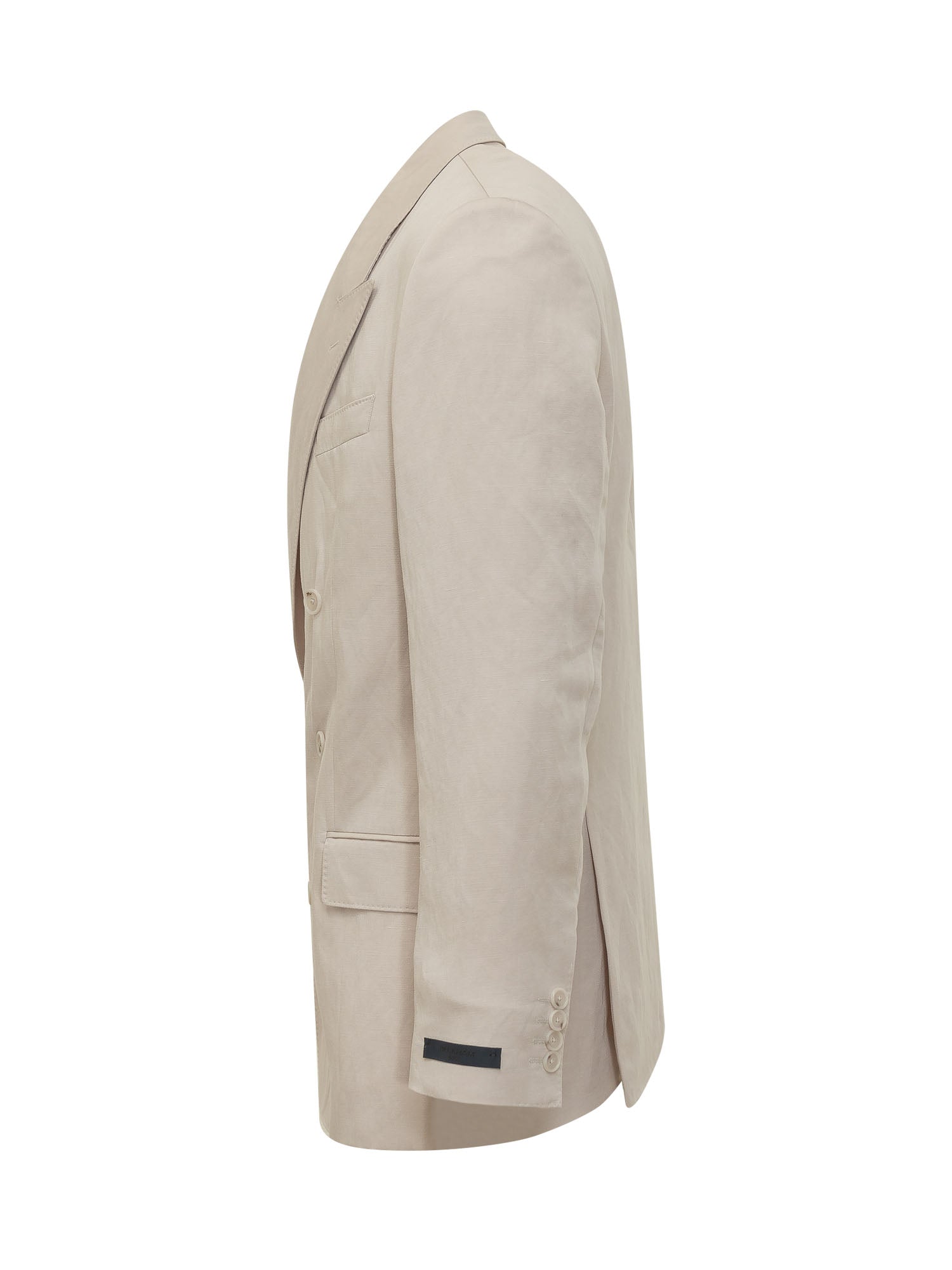 Elegant men's double-breasted blazer in a beige tone with a refined and contemporary design. Features classic lapels, front button closure, and flap pockets, ideal for formal or smart-casual looks.