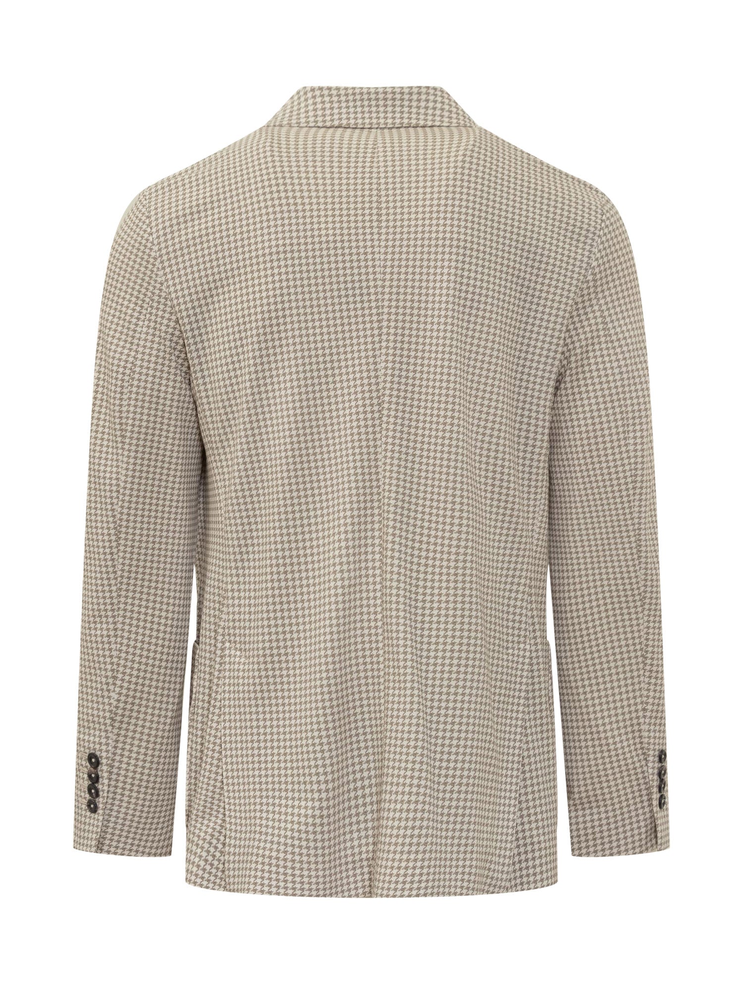 Classic lapels with buttonhole. Button fastening. Cuffs with buttons. Two patch pockets and one welt pocket.