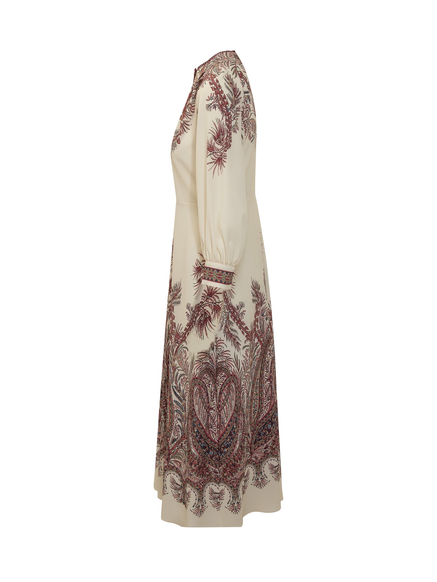 Etro midi dress in crepe featuring contrasting paisley print and 3/4 sleeves. With its fluid silhouette and detailed neckline, this piece offers a refined boho-chic