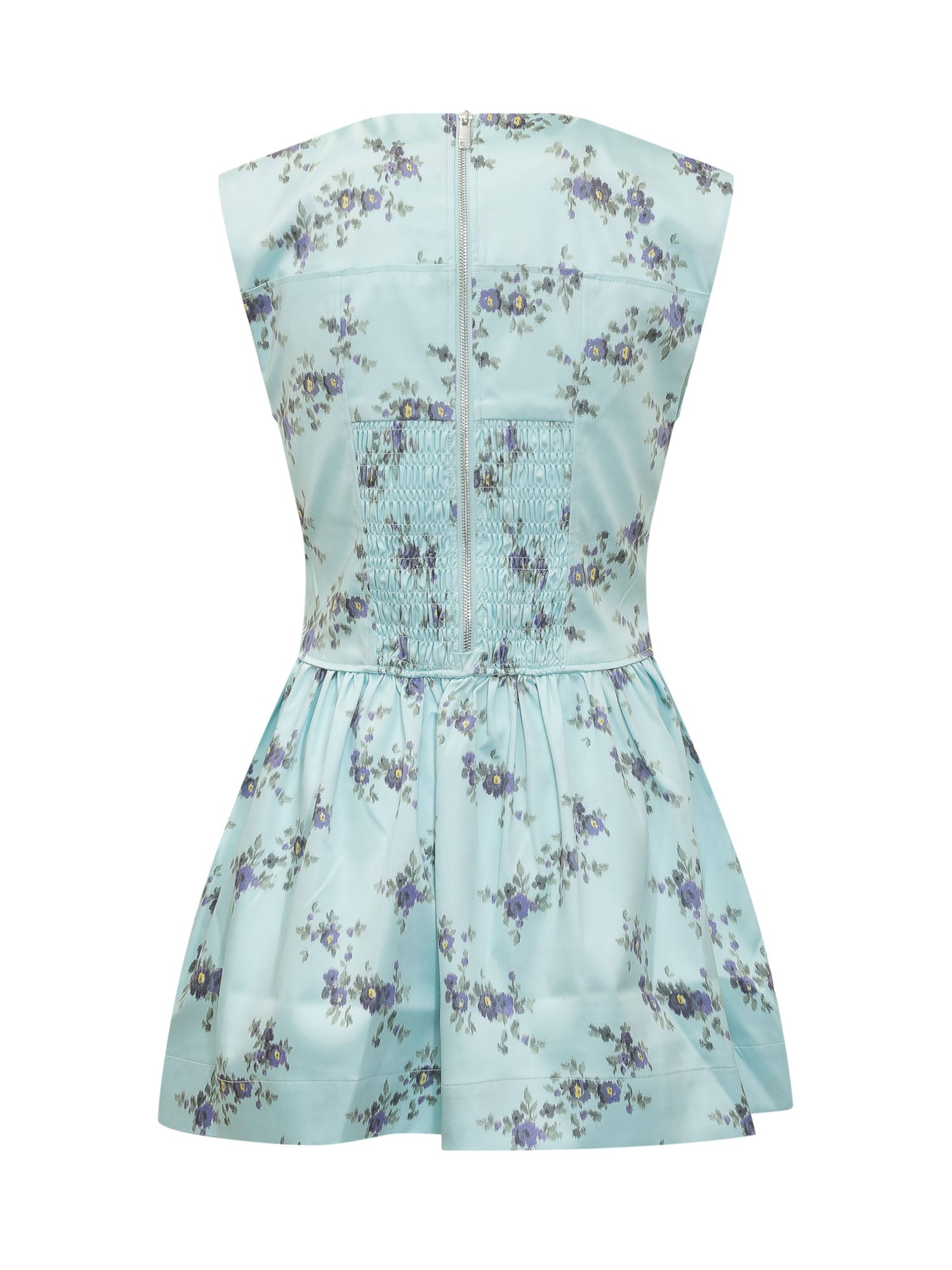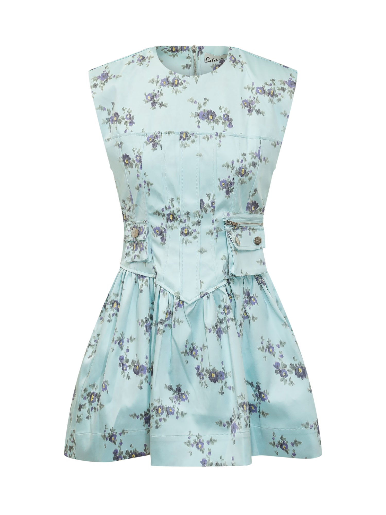 Sleeveless mini dress with structured bodice, flared skirt and floral print, patch pockets and back zip closure