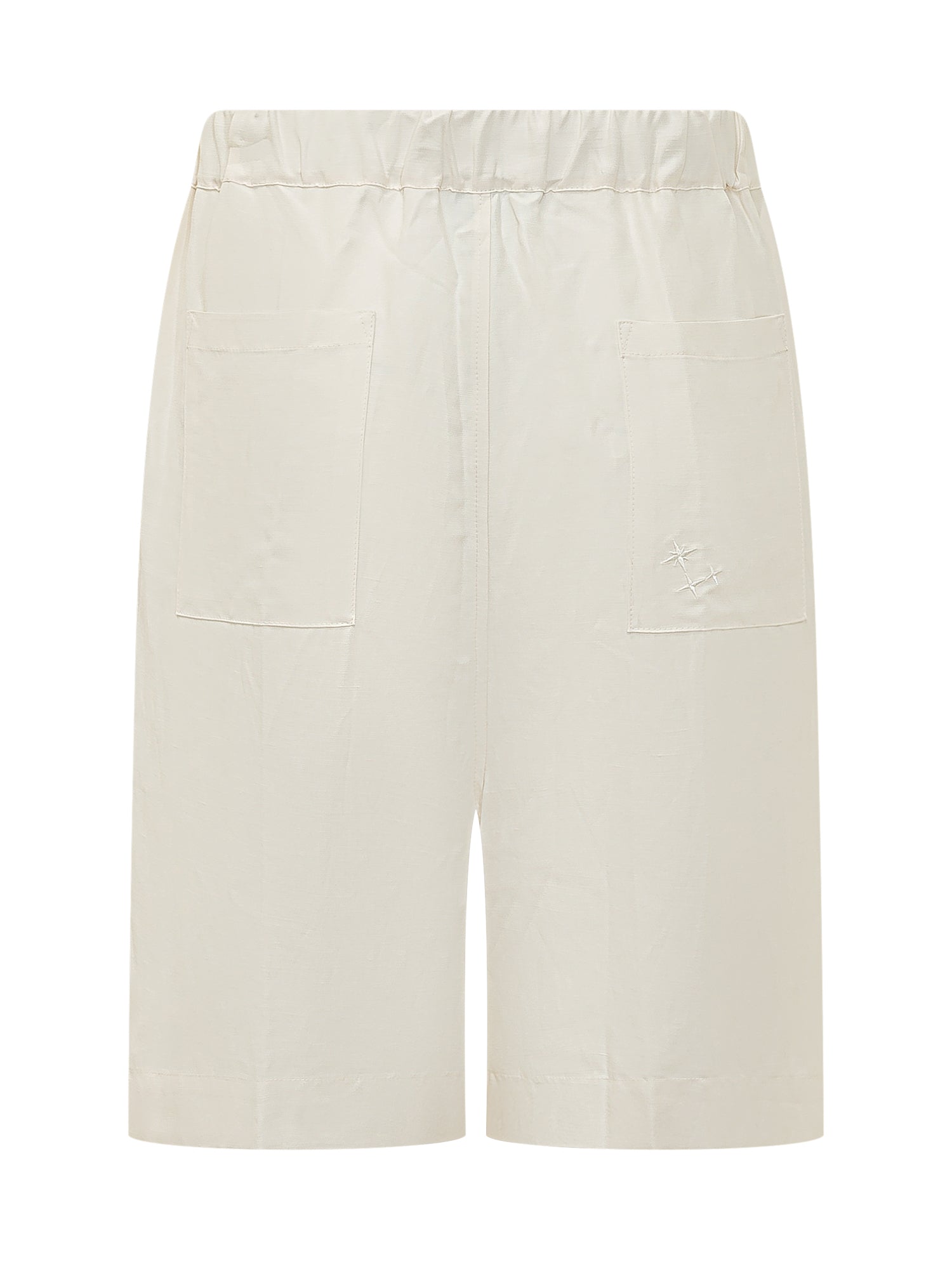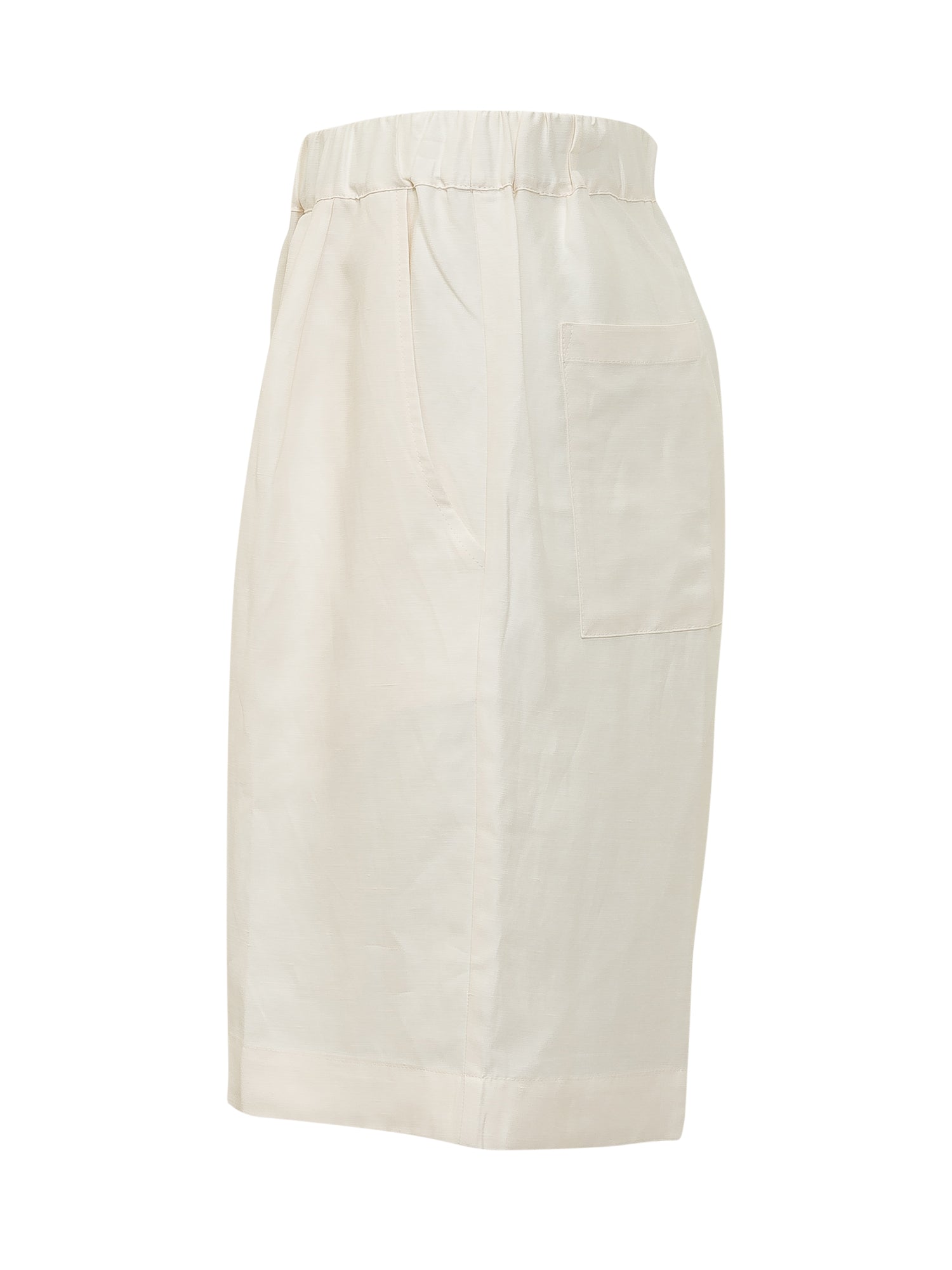 Ivory shorts featuring a clean and contemporary design with a wide, relaxed silhouette. Crafted from lightweight fabric, they are styled with an elasticated waistband for comfort and ease of wear. The soft cut and knee-length design make them ideal for minimal and refined summer looks.