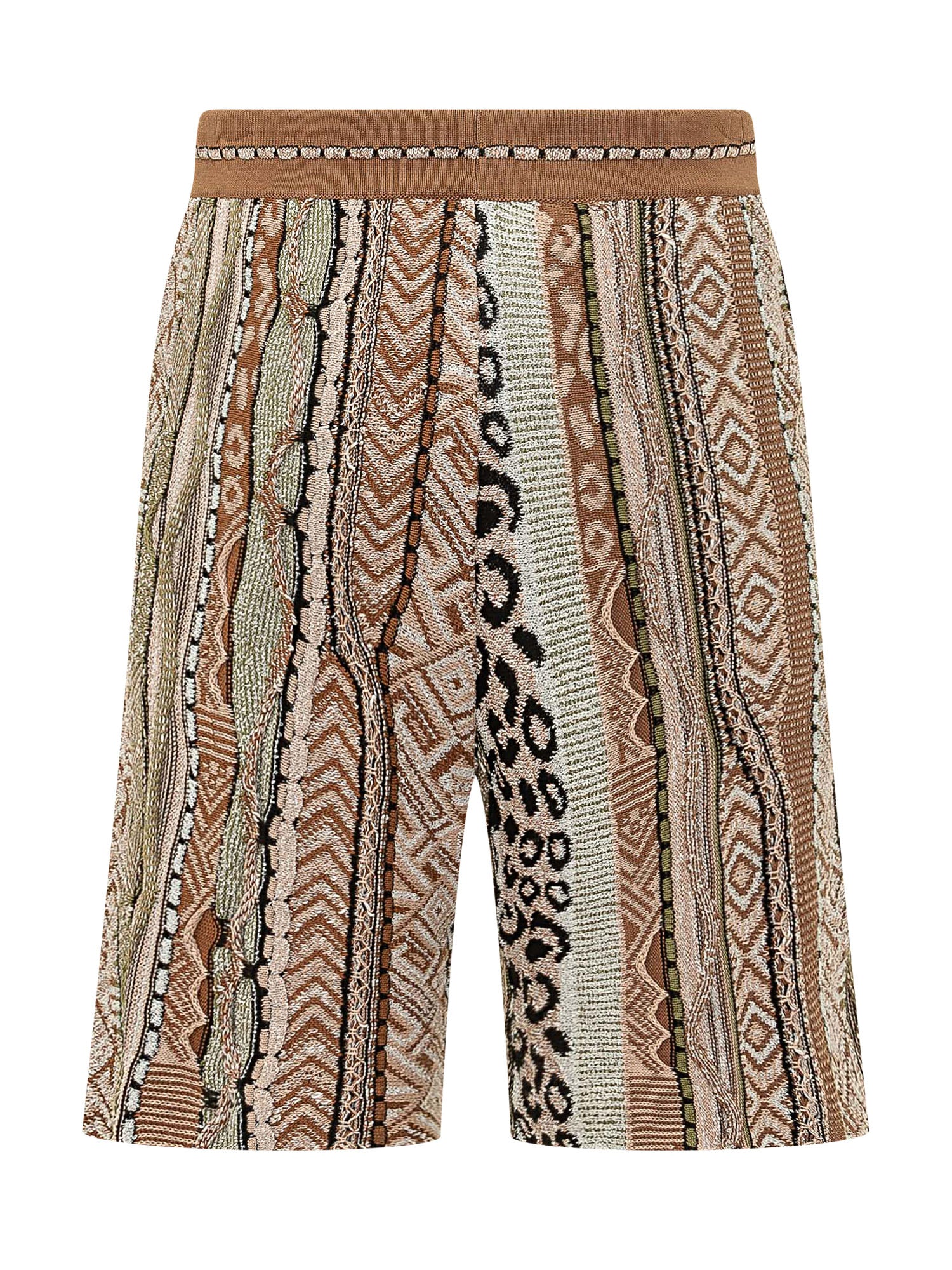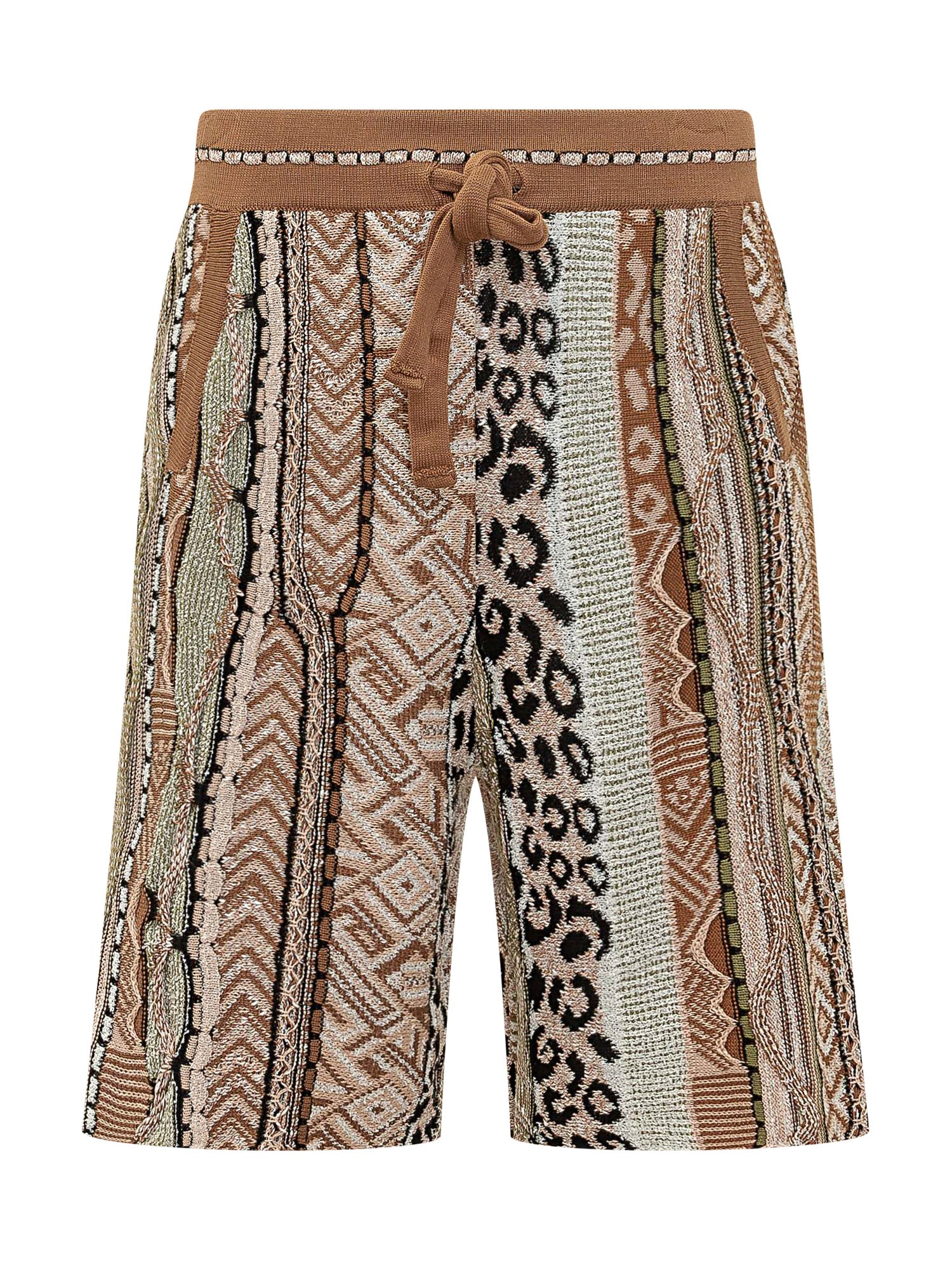 Knitted shorts featuring a rich multicolour jacquard pattern in shades of beige, brown, black, and olive green. The design blends geometric motifs with subtle animal-inspired details for a bold and contemporary look. Styled with an elasticated waistband and adjustable drawstring, with ribbed trims for enhanced comfort. Perfect to pair with the matching shirt for a distinctive and refined total look.