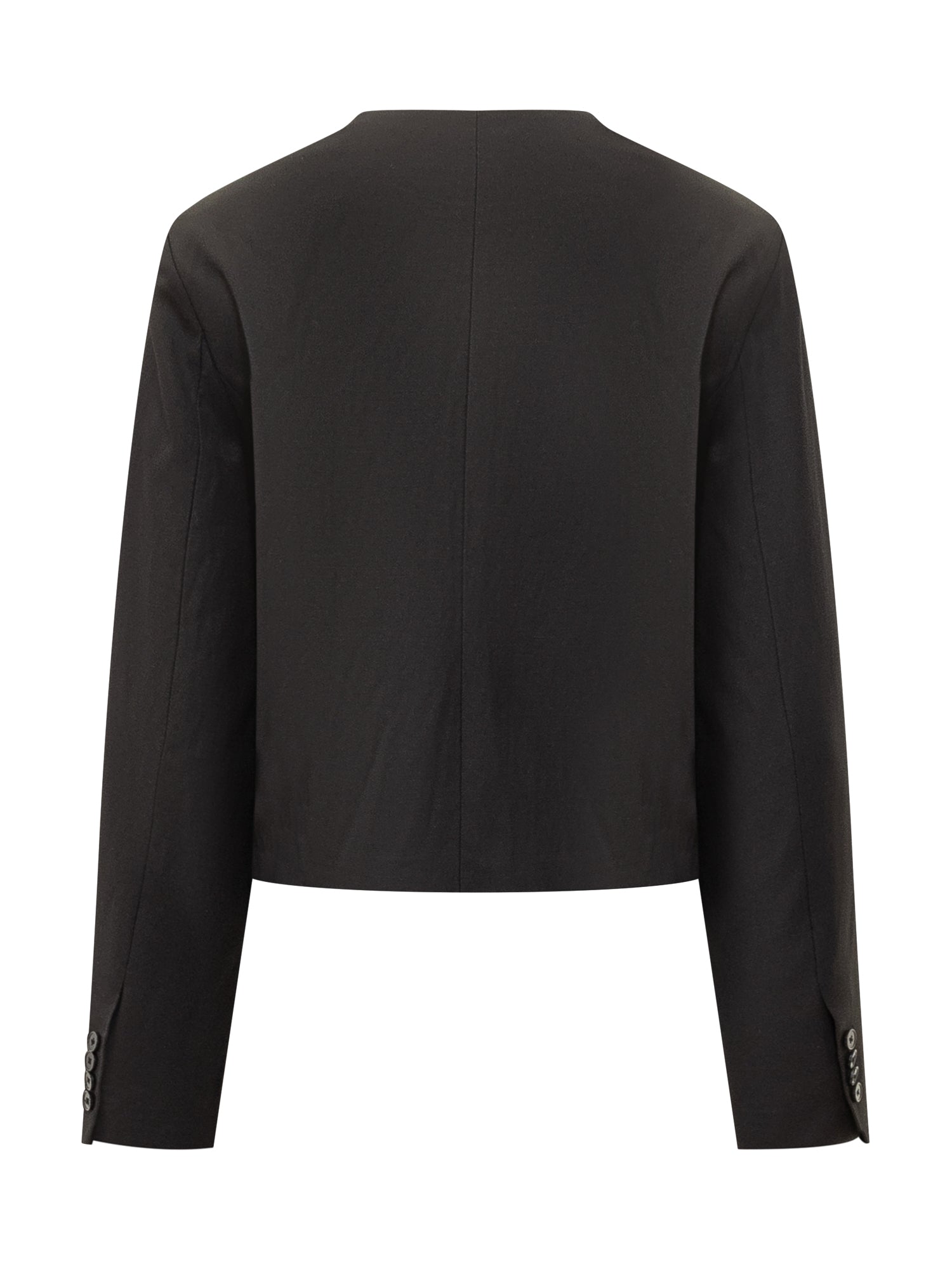 Double-breasted button closure. Long sleeves. Cropped cut. Flush pockets on sides.
