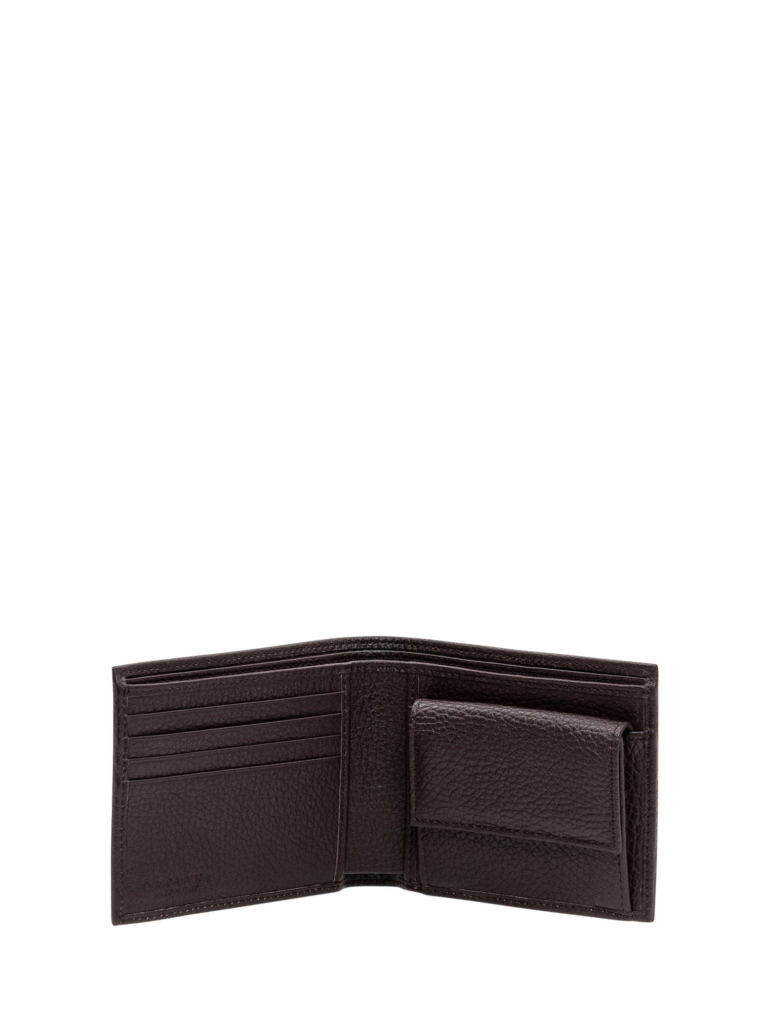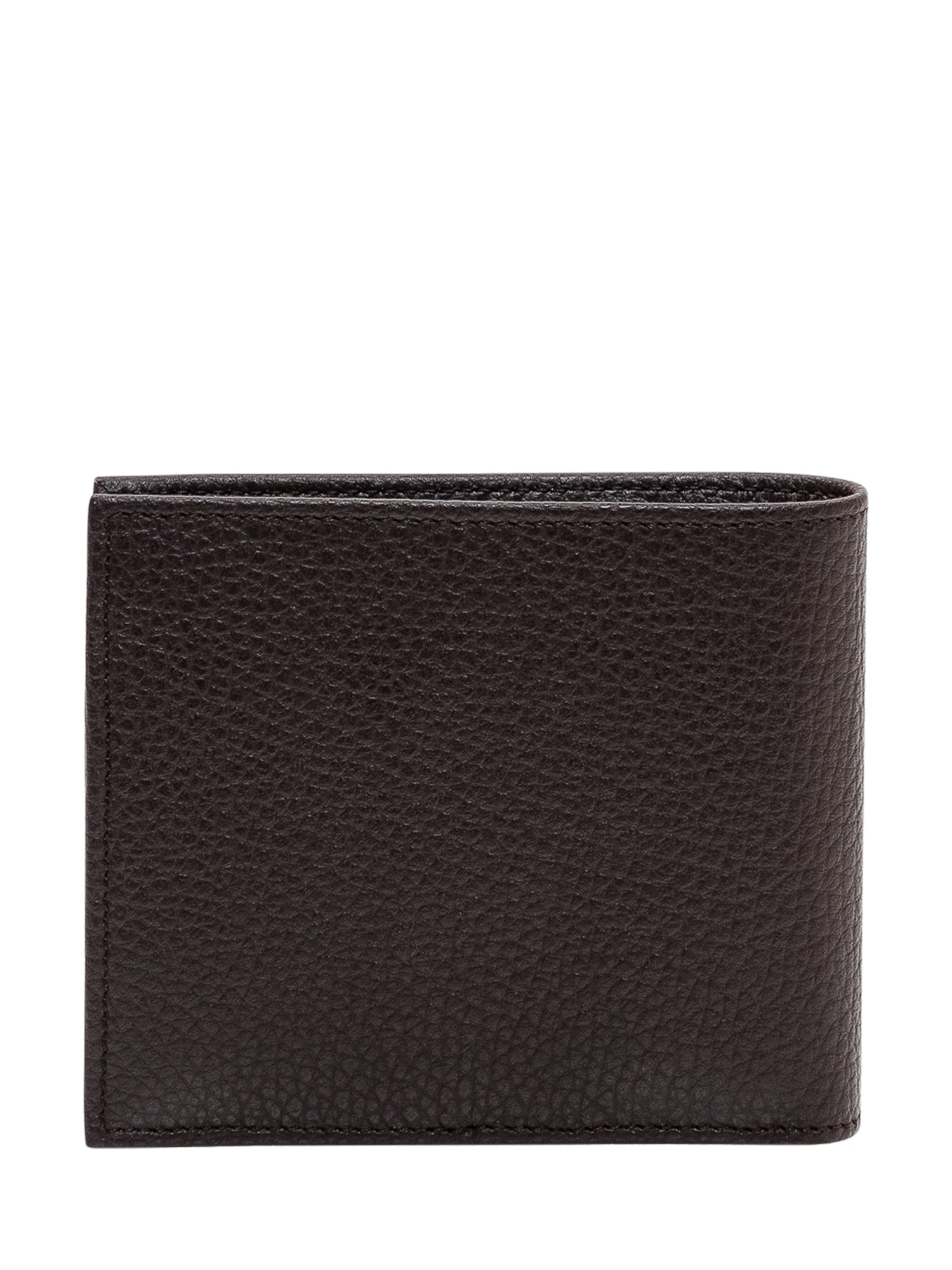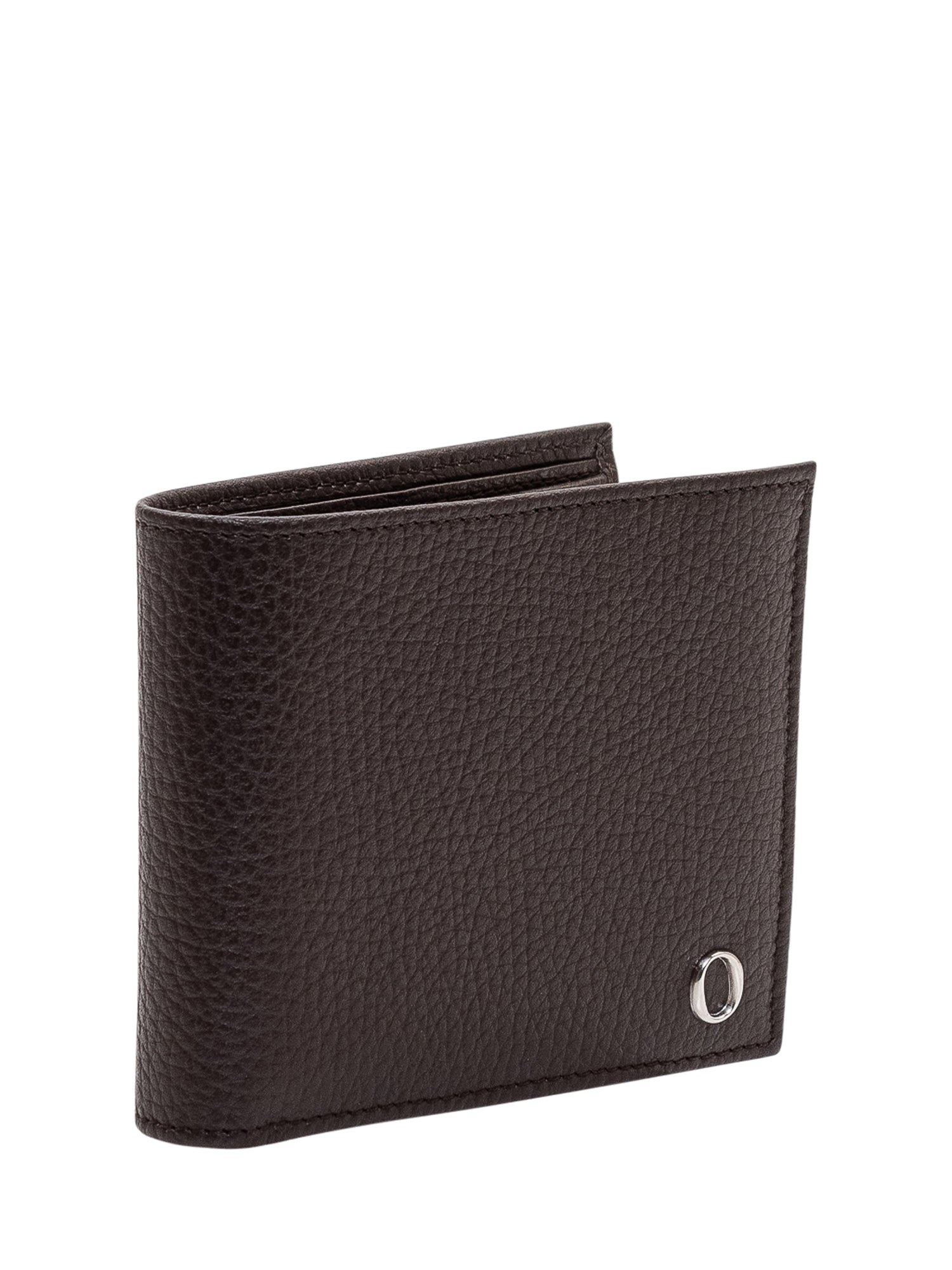 Micron wallet with compact structure and textured finish. Applied metal logo and book style opening.