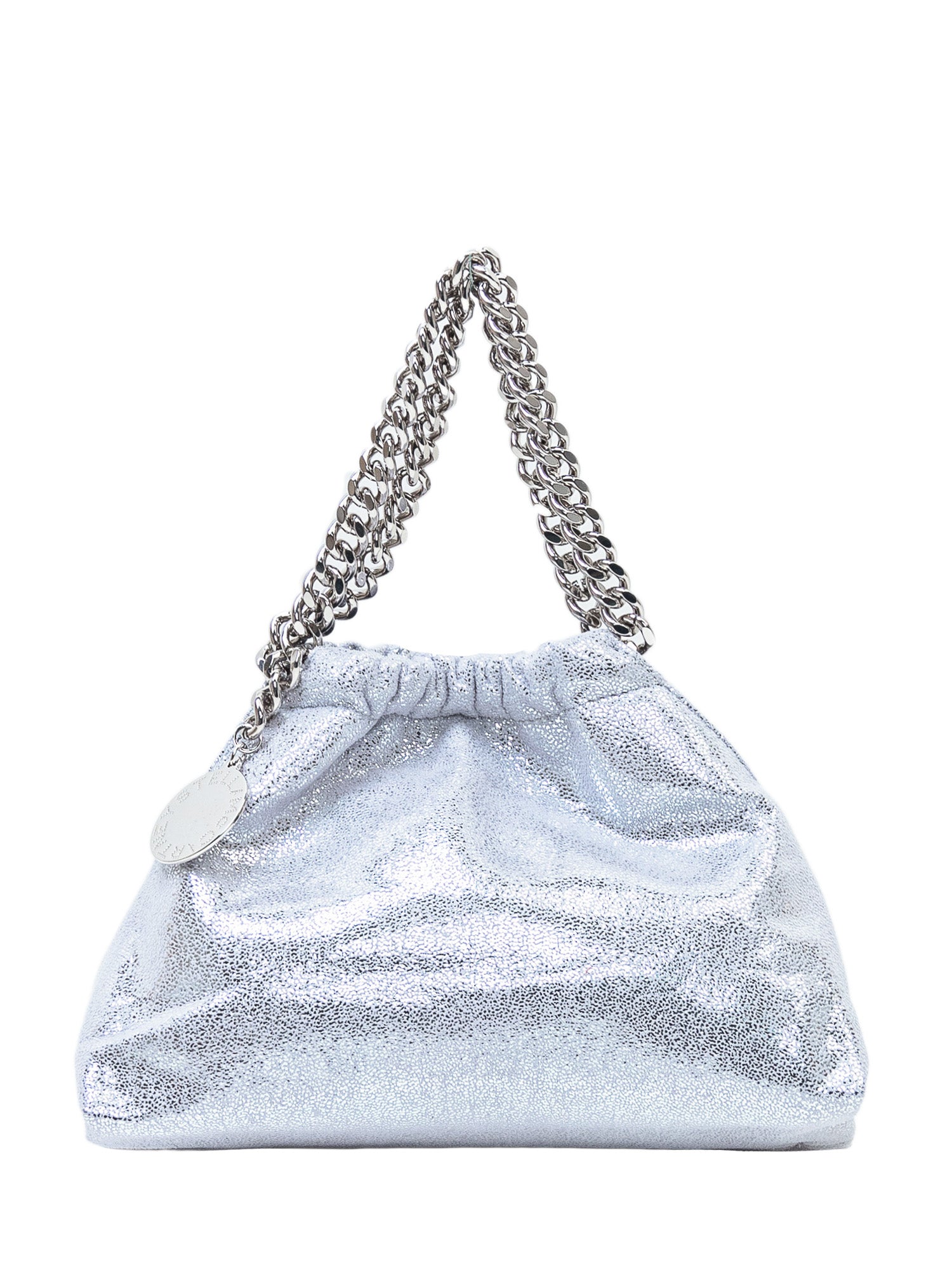 Soft handbag featuring a shimmering metallic texture and chain handle.
