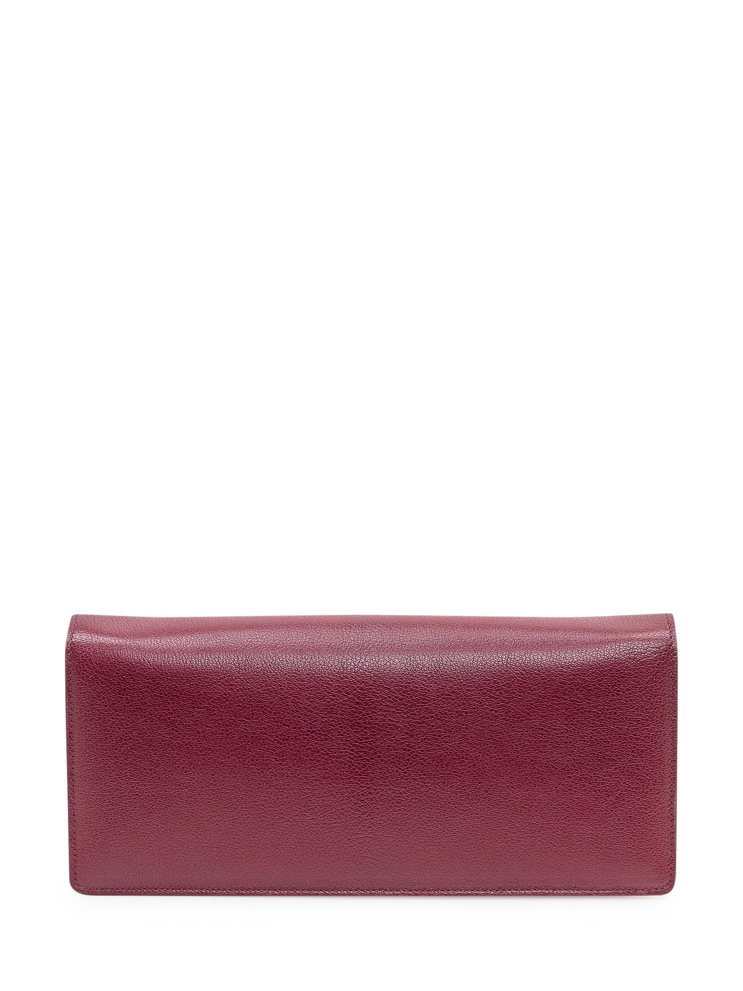 Bordeaux leather clutch with elegant metallic closure.