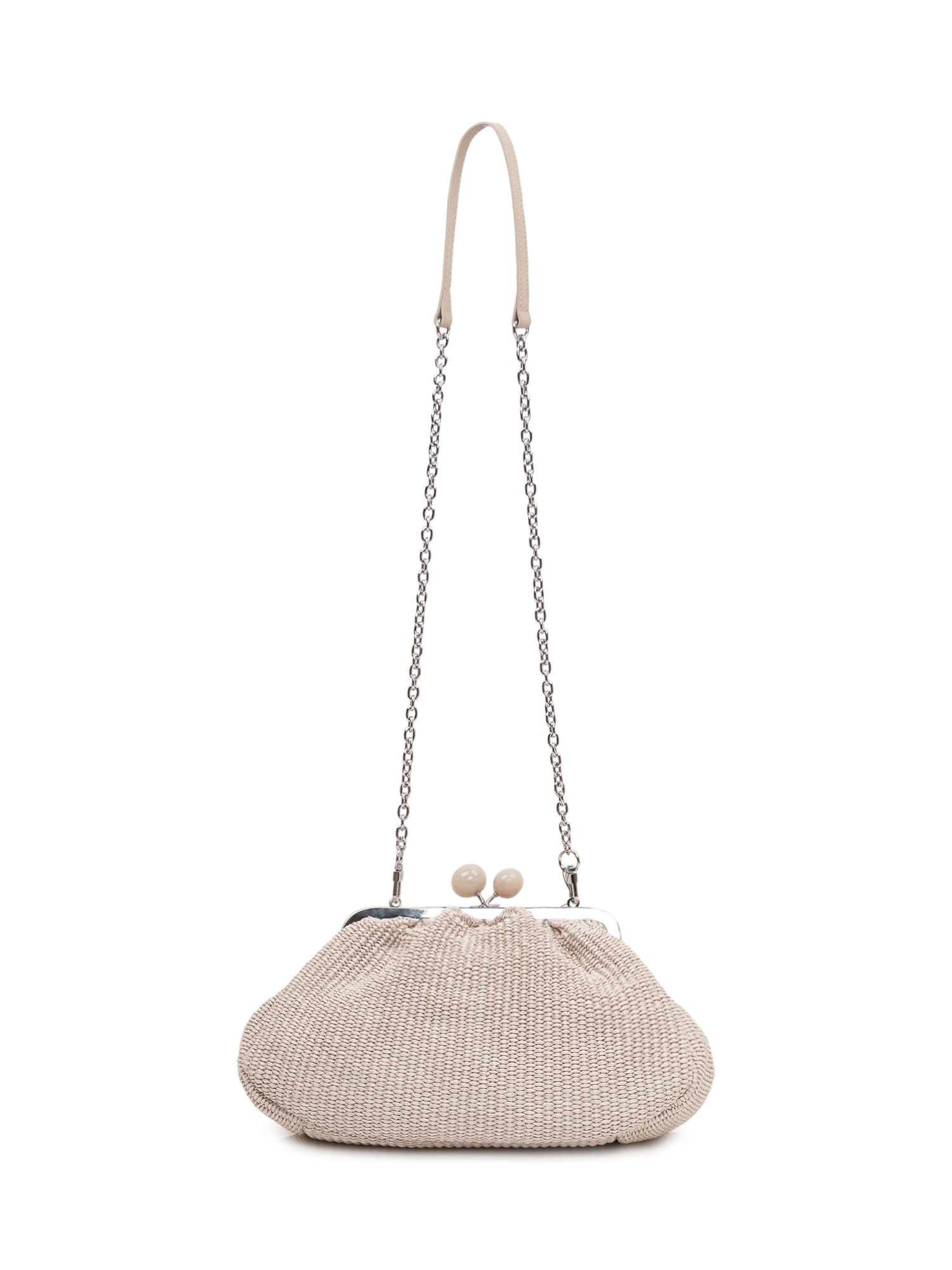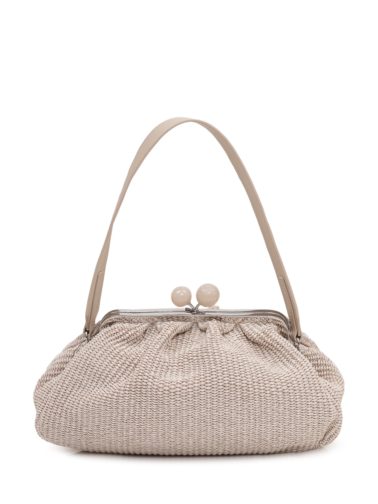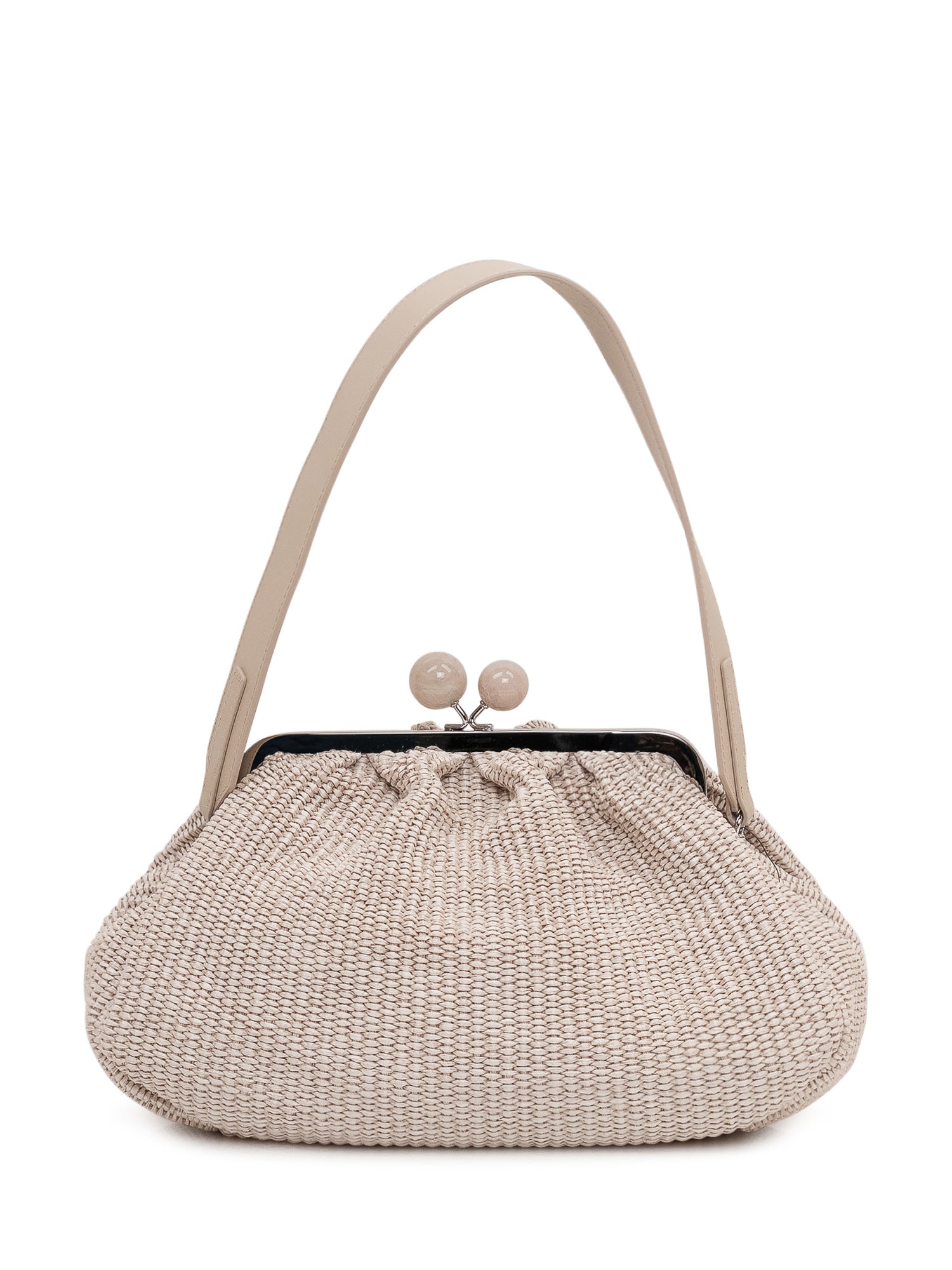 Raffia bag featuring a top handle and clasp closure with decorative spheres. Soft and roomy design, perfect for completing summer looks.
