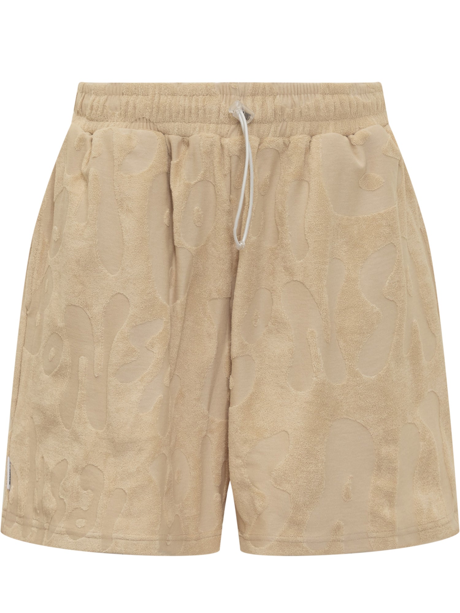 Beige short pants. Drawstring elastic at the waist. Flush pockets at sides and back.