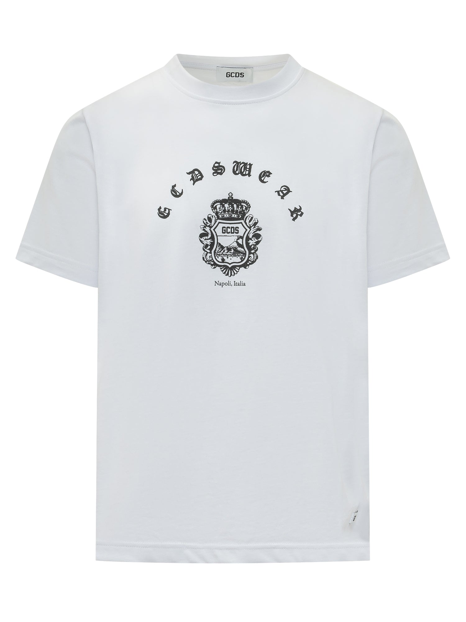 Short-sleeve T-shirt with crew neck and front print featuring crest and decorative lettering. Straight cut with regular shoulders. Distinctive design with central graphic detail.