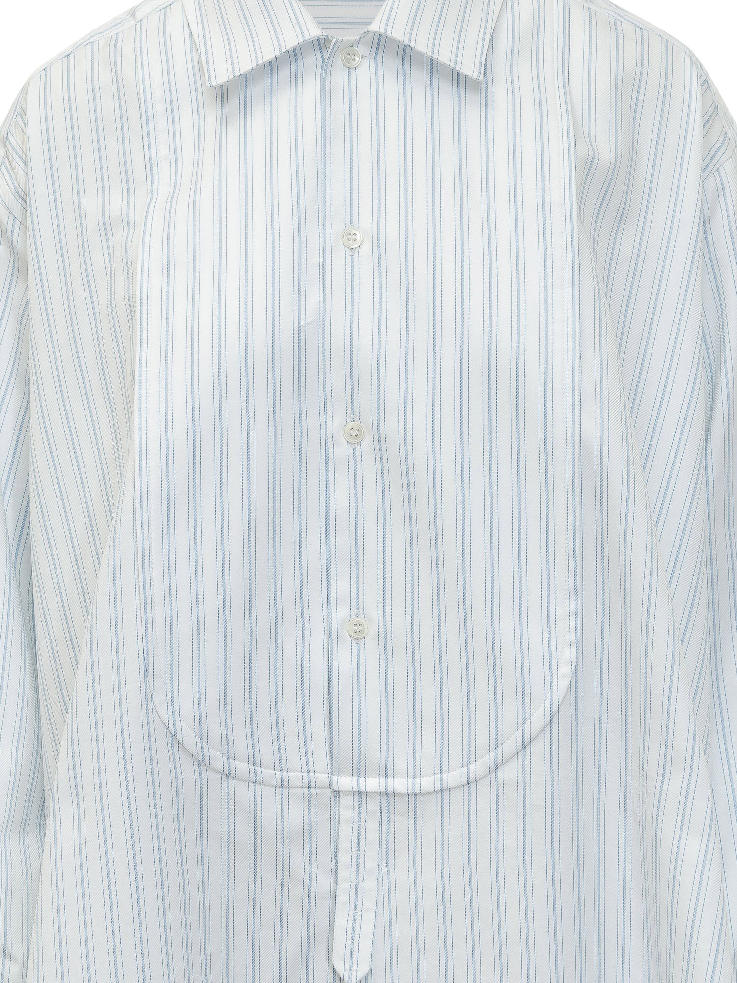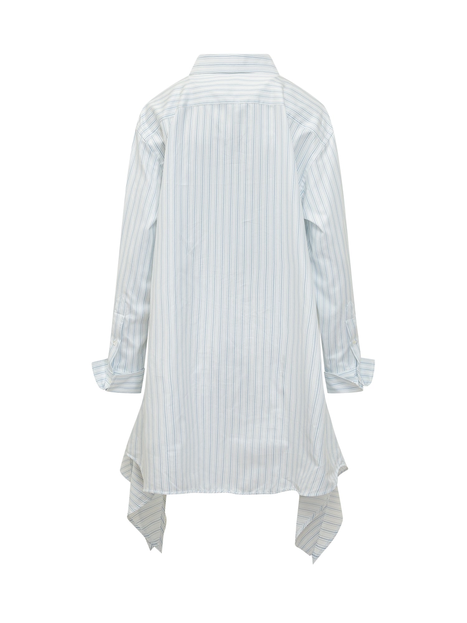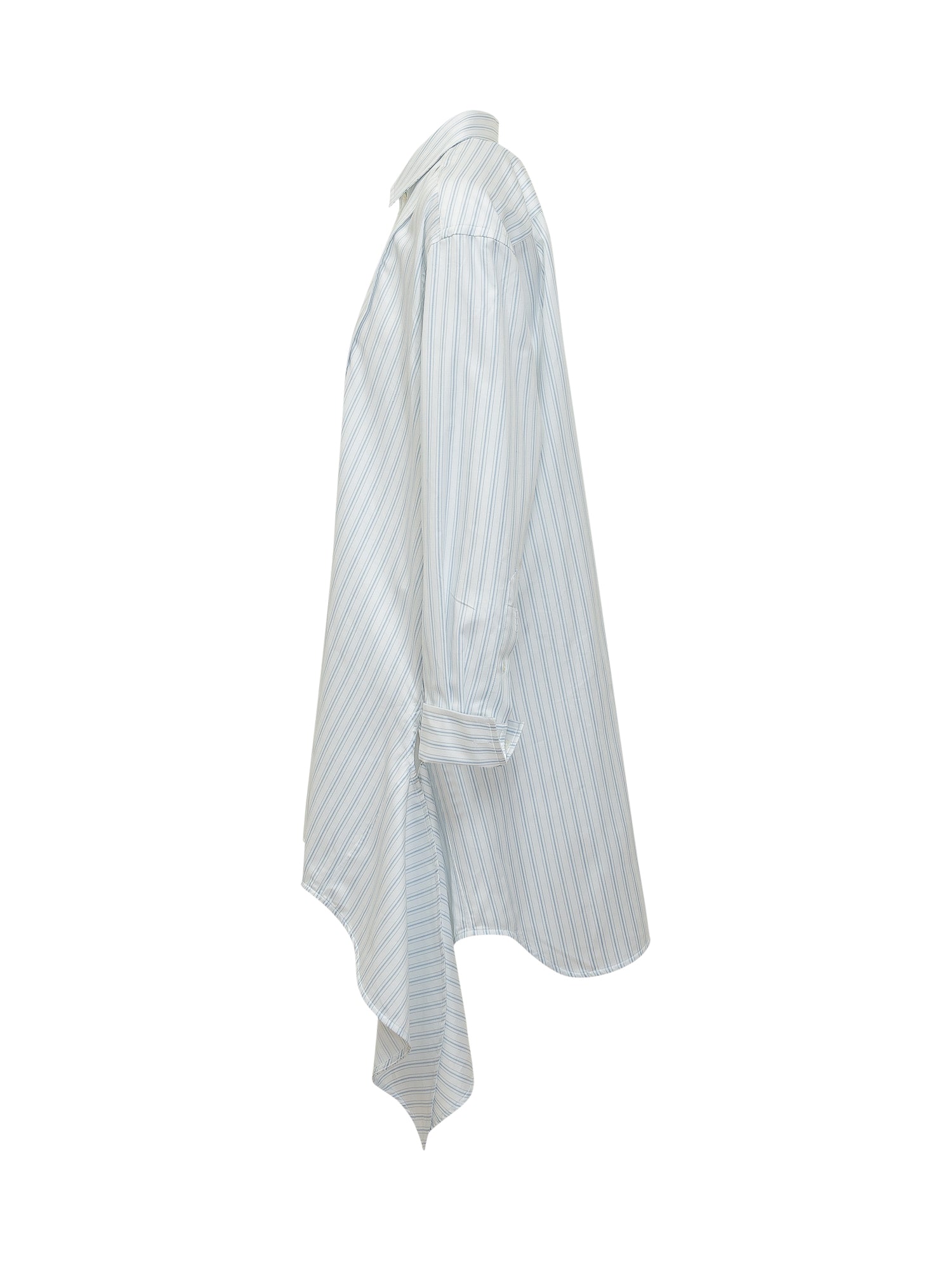 Shirt dress featuring a classic collar and front button closure. Designed with vertical striped pattern, long sleeves with cuffs and asymmetric hem with side knot detail. Fluid silhouette ideal for contemporary looks.