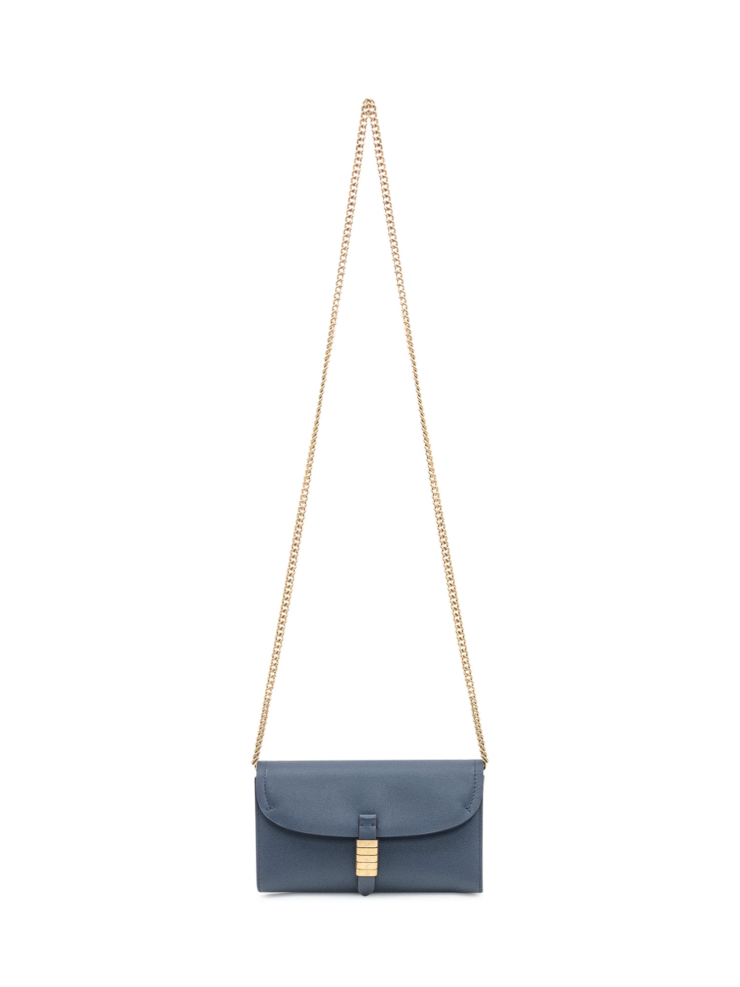 Pinko Saddle wallet in blue leather with gold chain strap and logo closure.