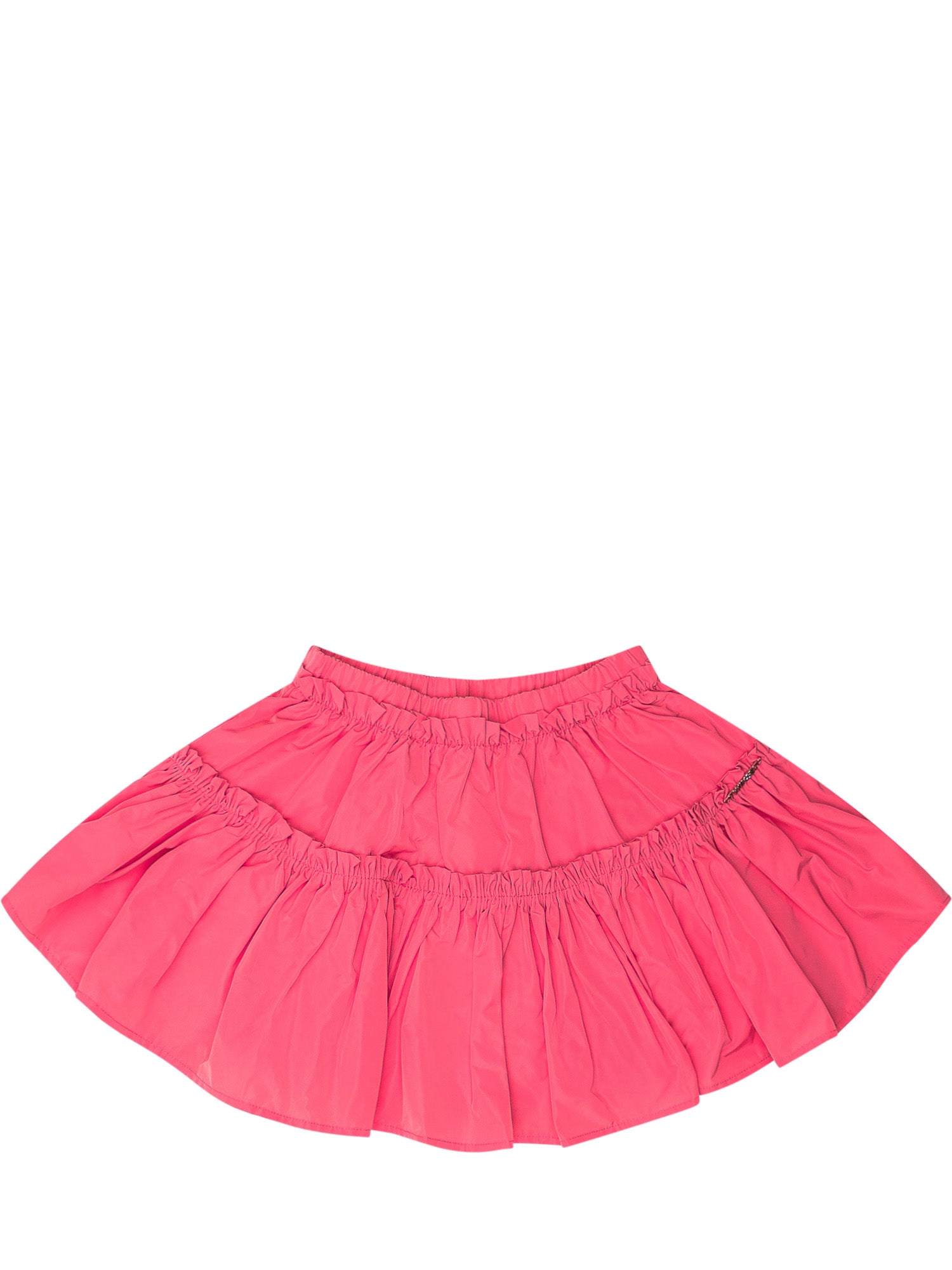 Pink ruffle skirt. Elasticized waistband. Metal logo on the front.