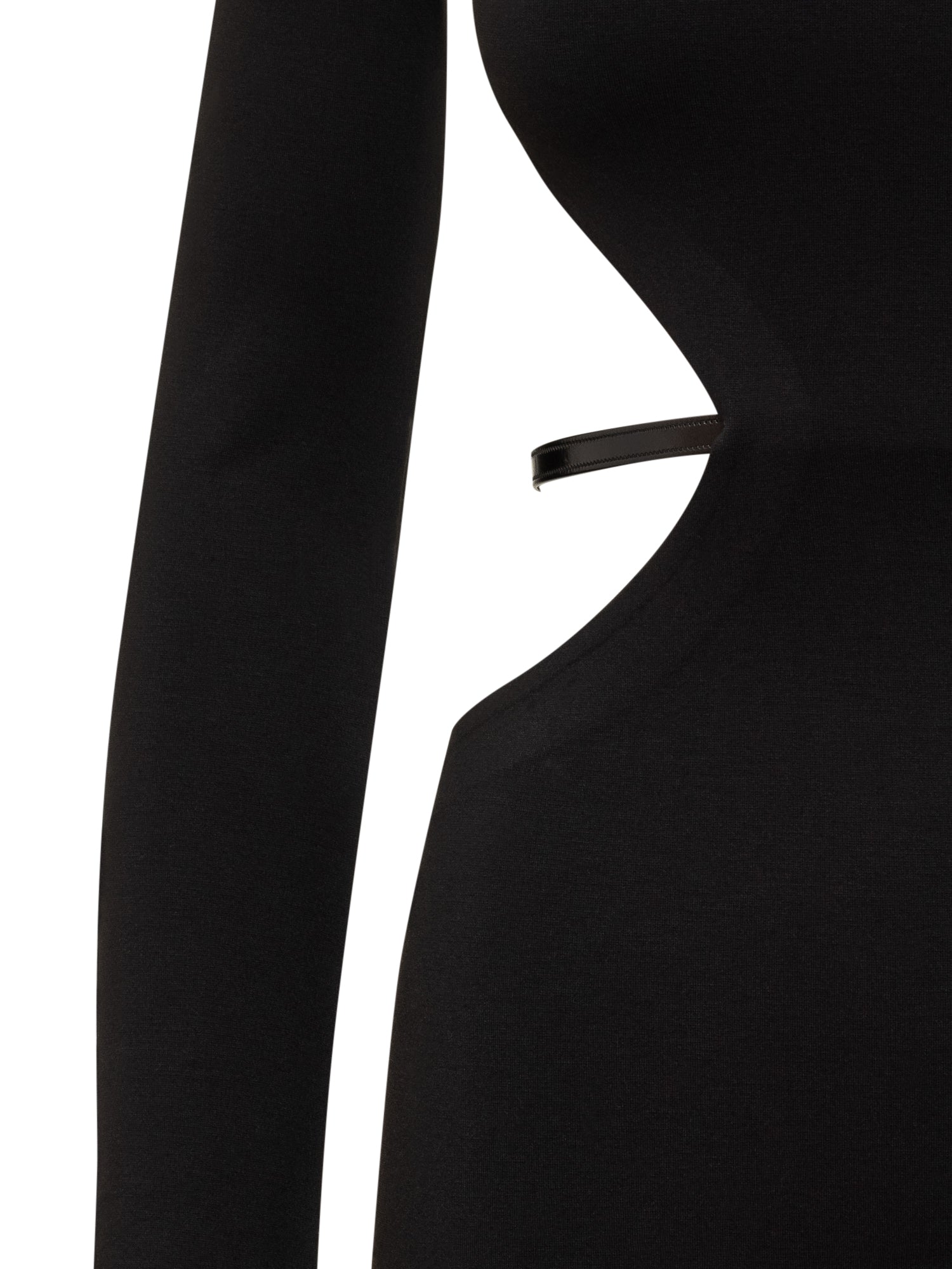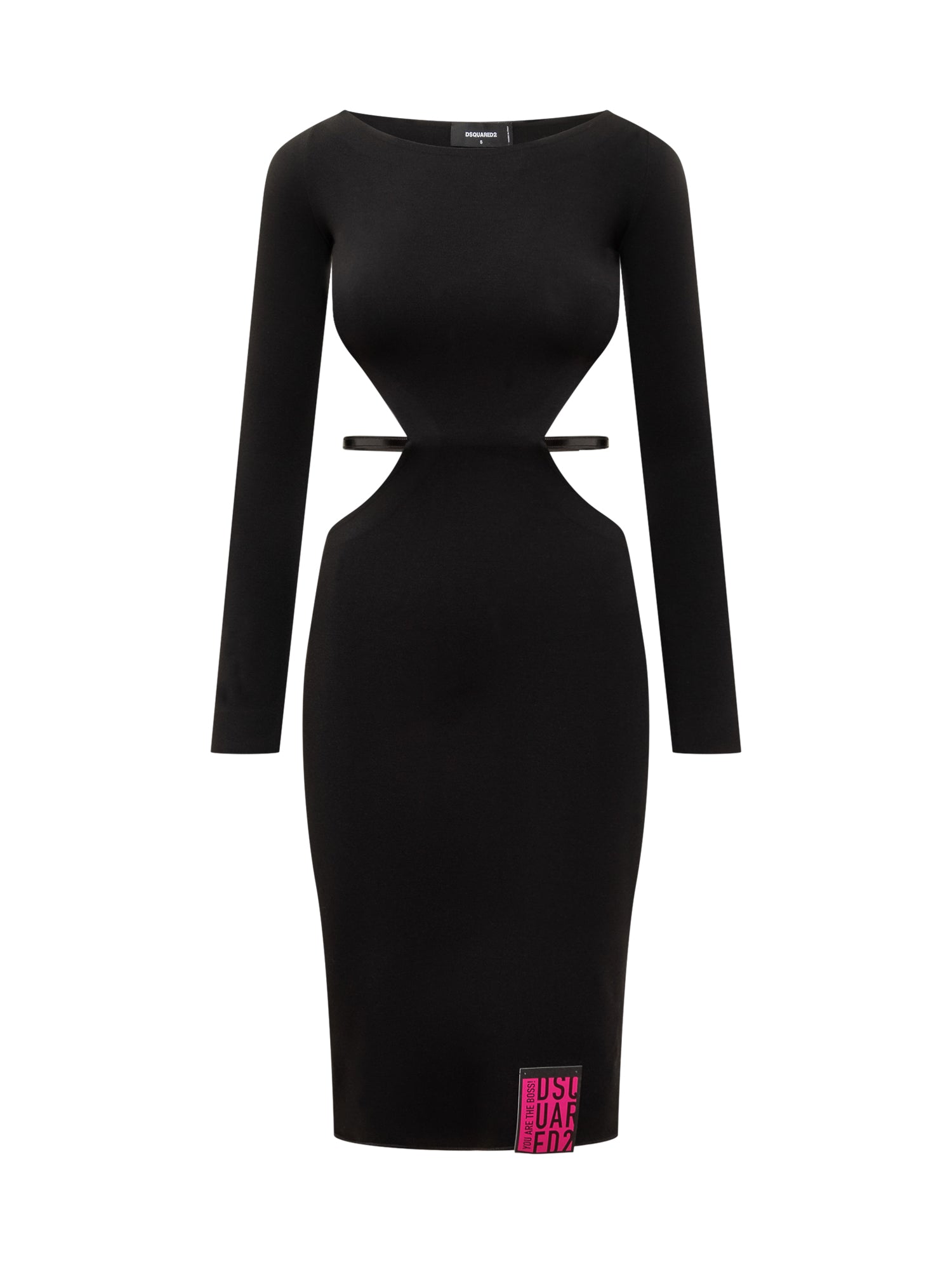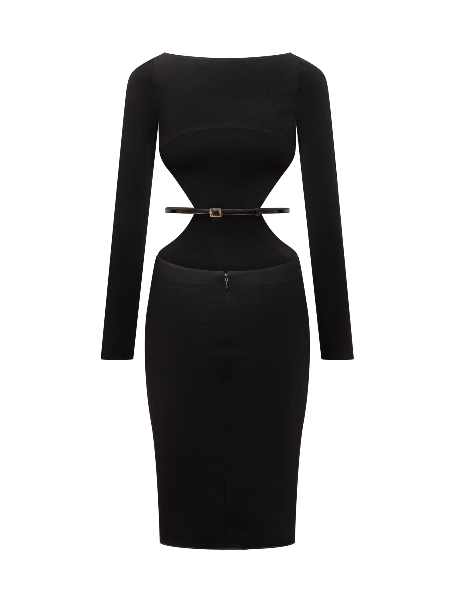 Long-sleeved midi dress. Round neckline. Zip fastening on the back. Waist belt. Wide cut out on the back.
