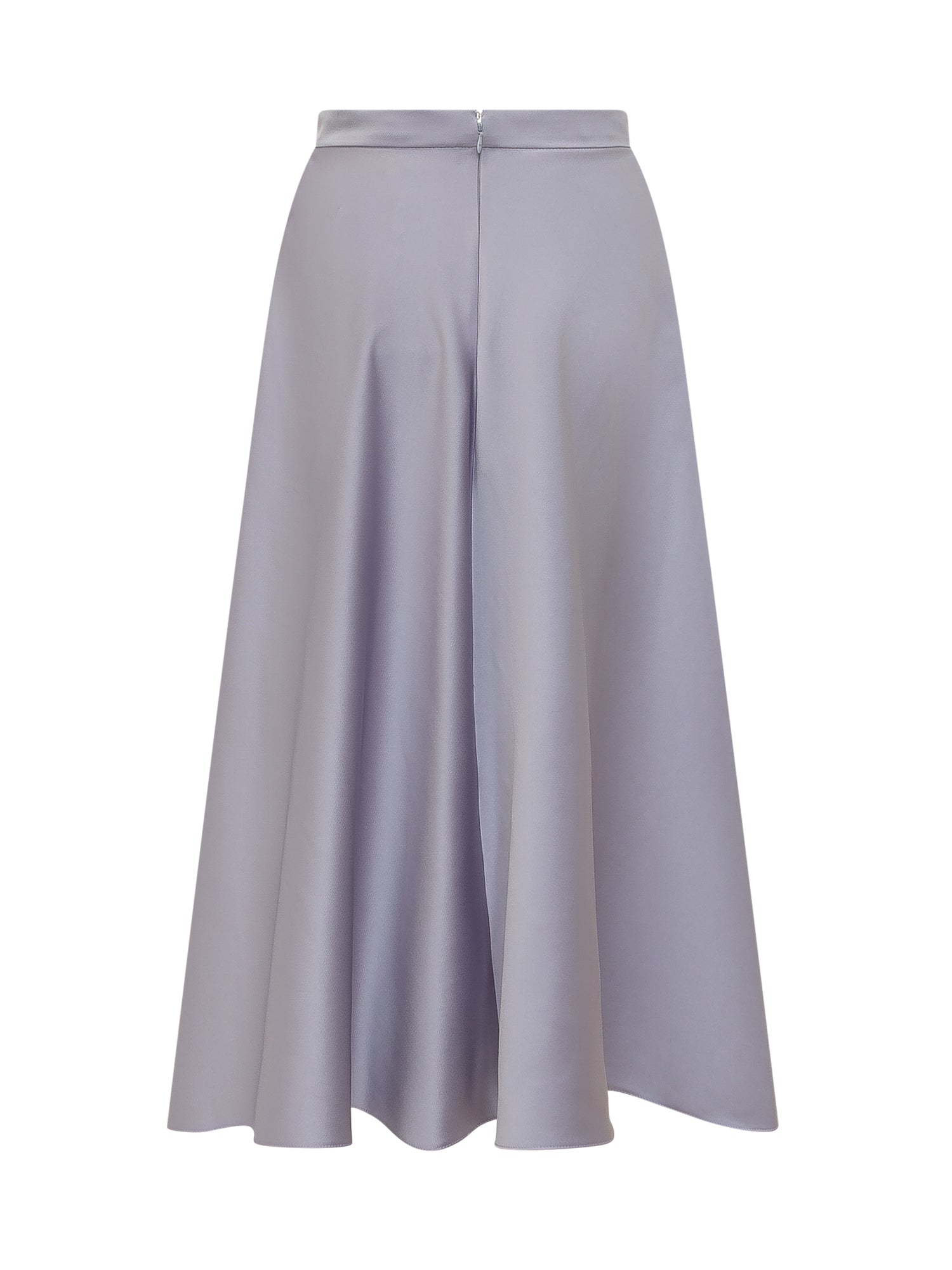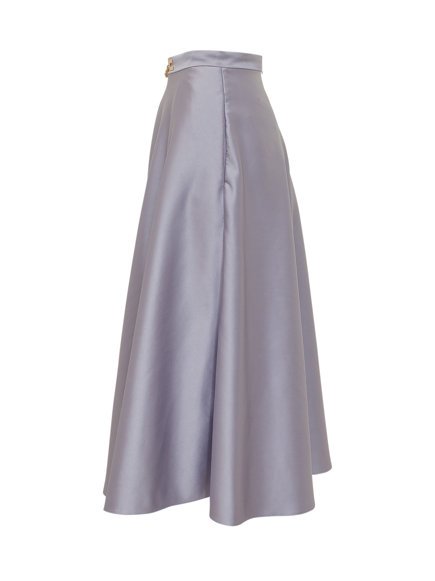 High waisted midi skirt with flared shape, decorative chain detail at the waistband, back closure, fluid fabric with elegant drape.