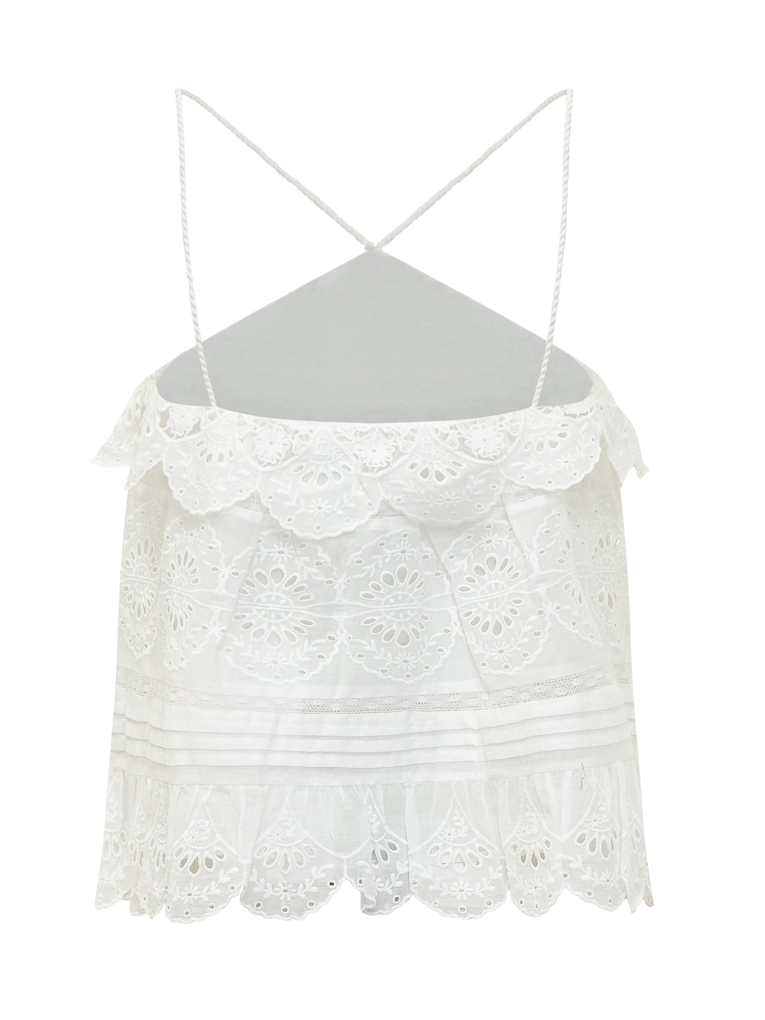 Sleeveless top with thin straps crossed at the back. Decorative embroidery and finished hem complete the garment.