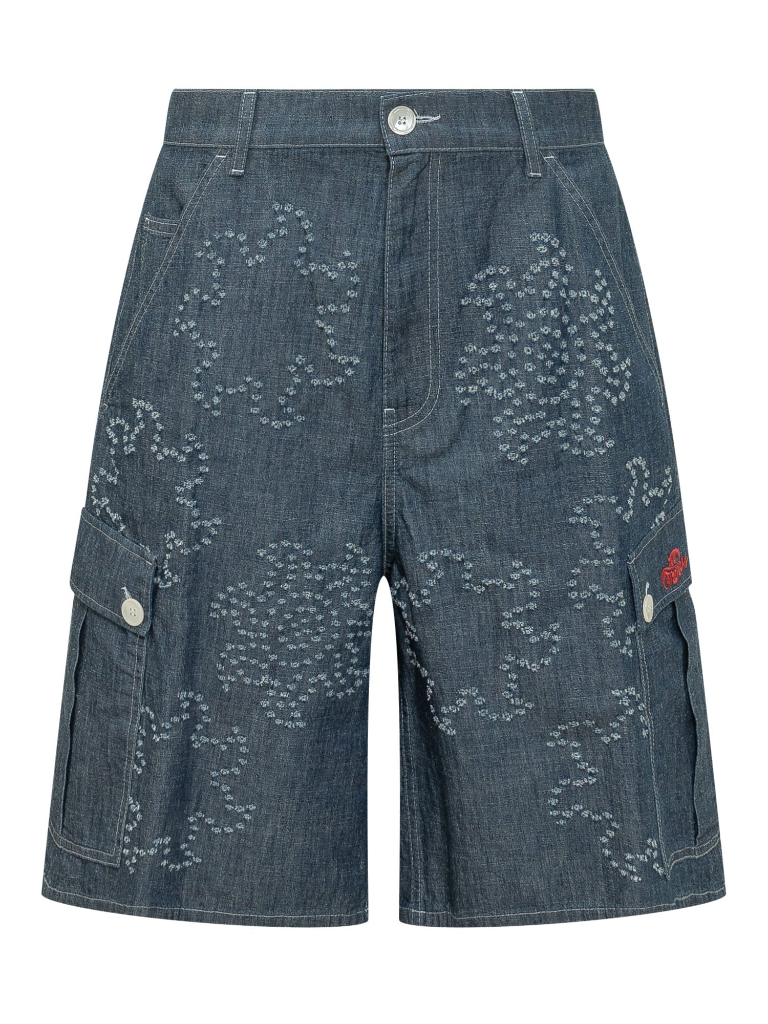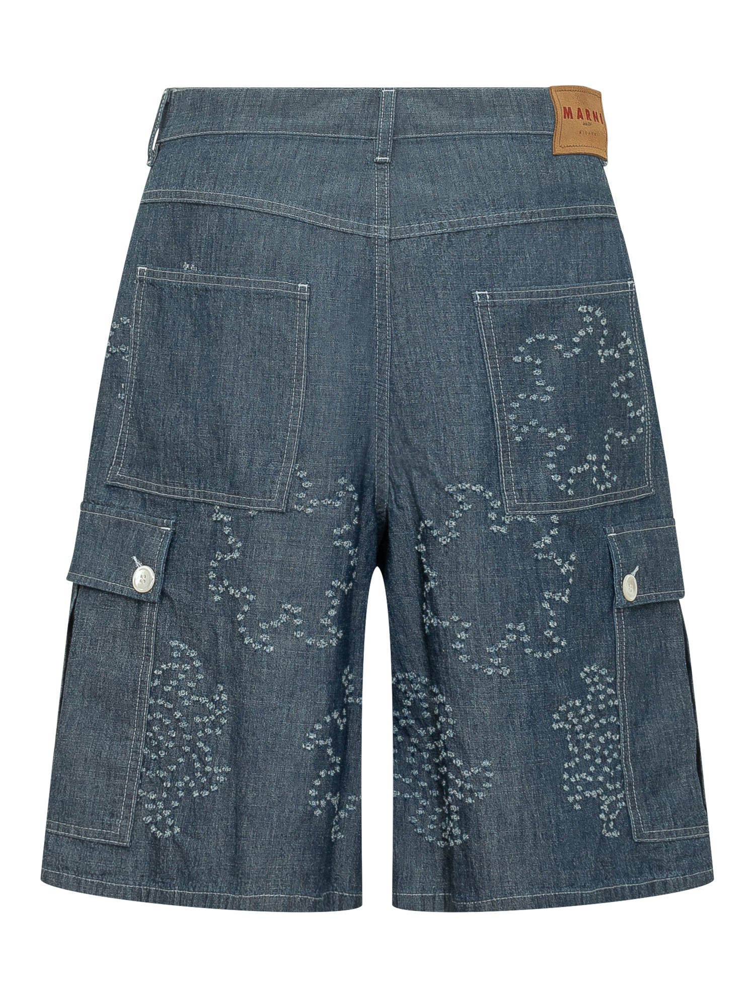 Bermuda shorts with front button closure and belt loops. Design with side cargo pockets with flap and allover graphic pattern made of repeated elements. Wide silhouette suitable for contemporary outfits.