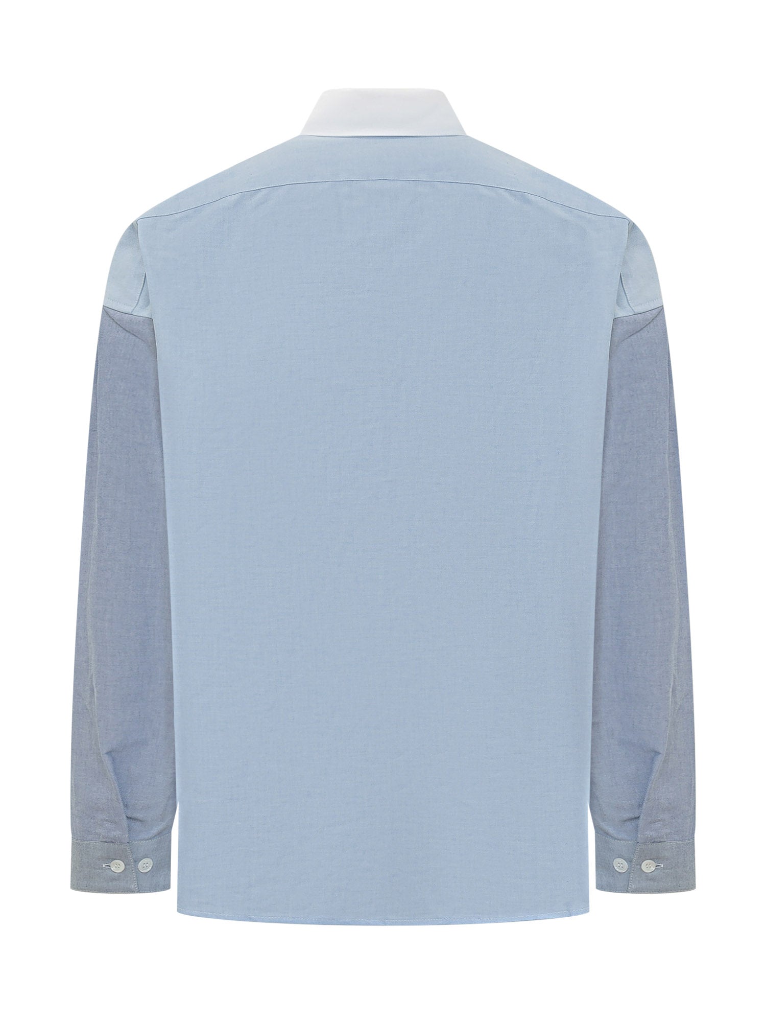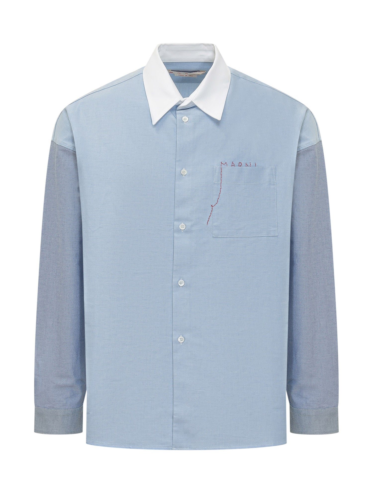 Long sleeve shirt with contrast collar and front button closure, patch pocket on the chest with embroidered logo detail. Clean design ideal for contemporary outfits.