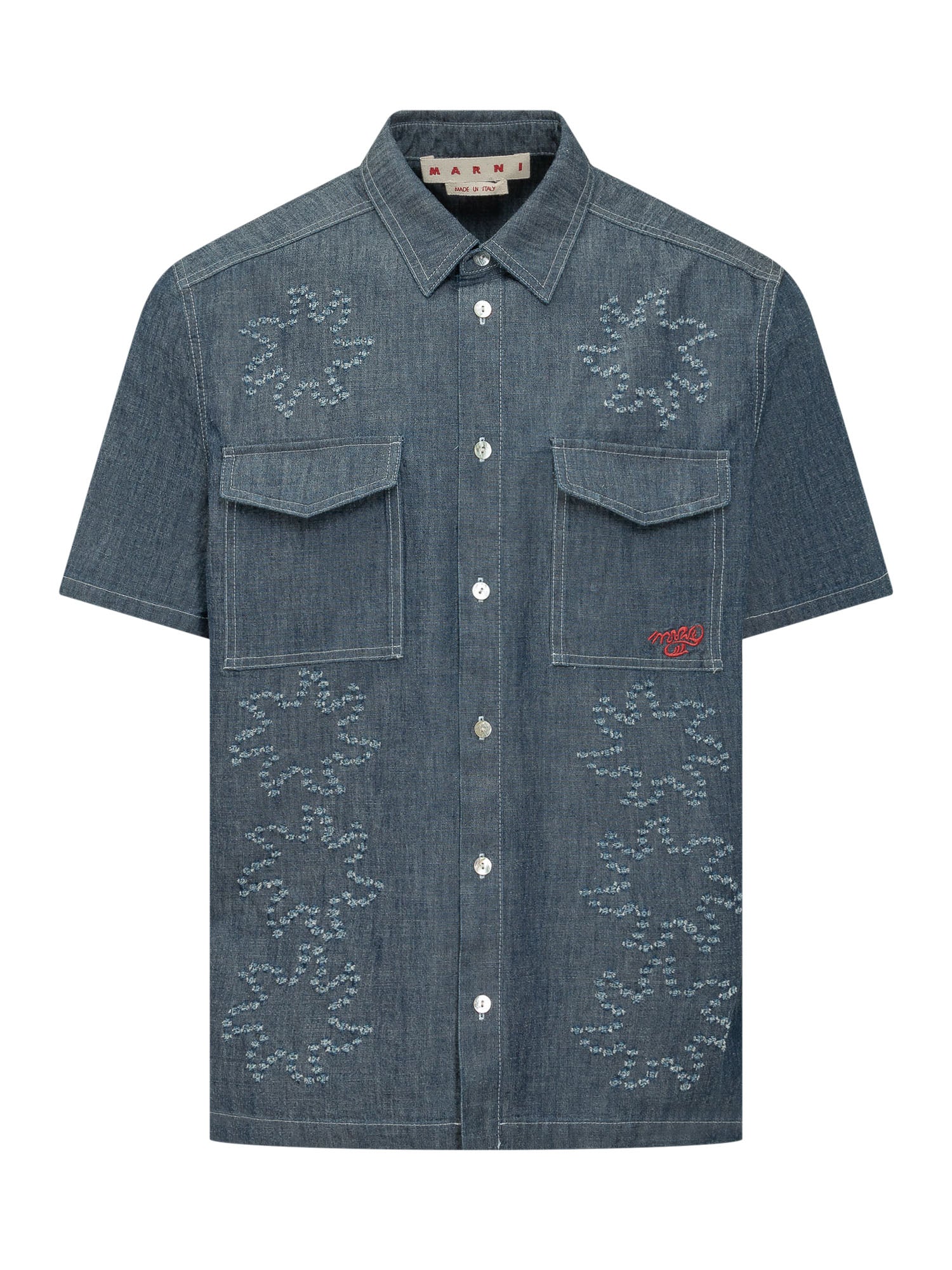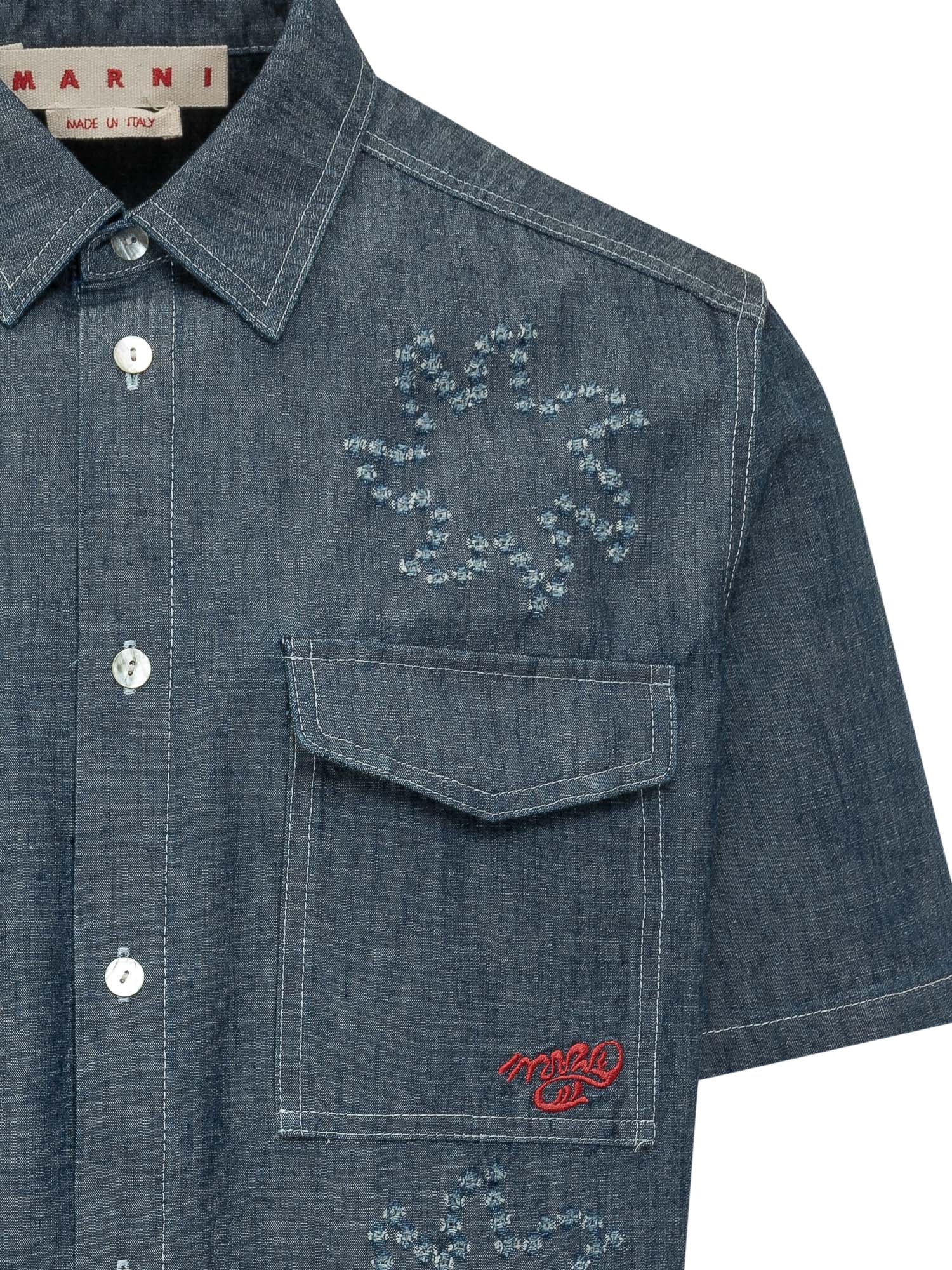 Short sleeve denim shirt with classic collar and front button closure, patch chest pockets with flap and decorative embroidery on the front. Regular fit ideal for casual outfits.