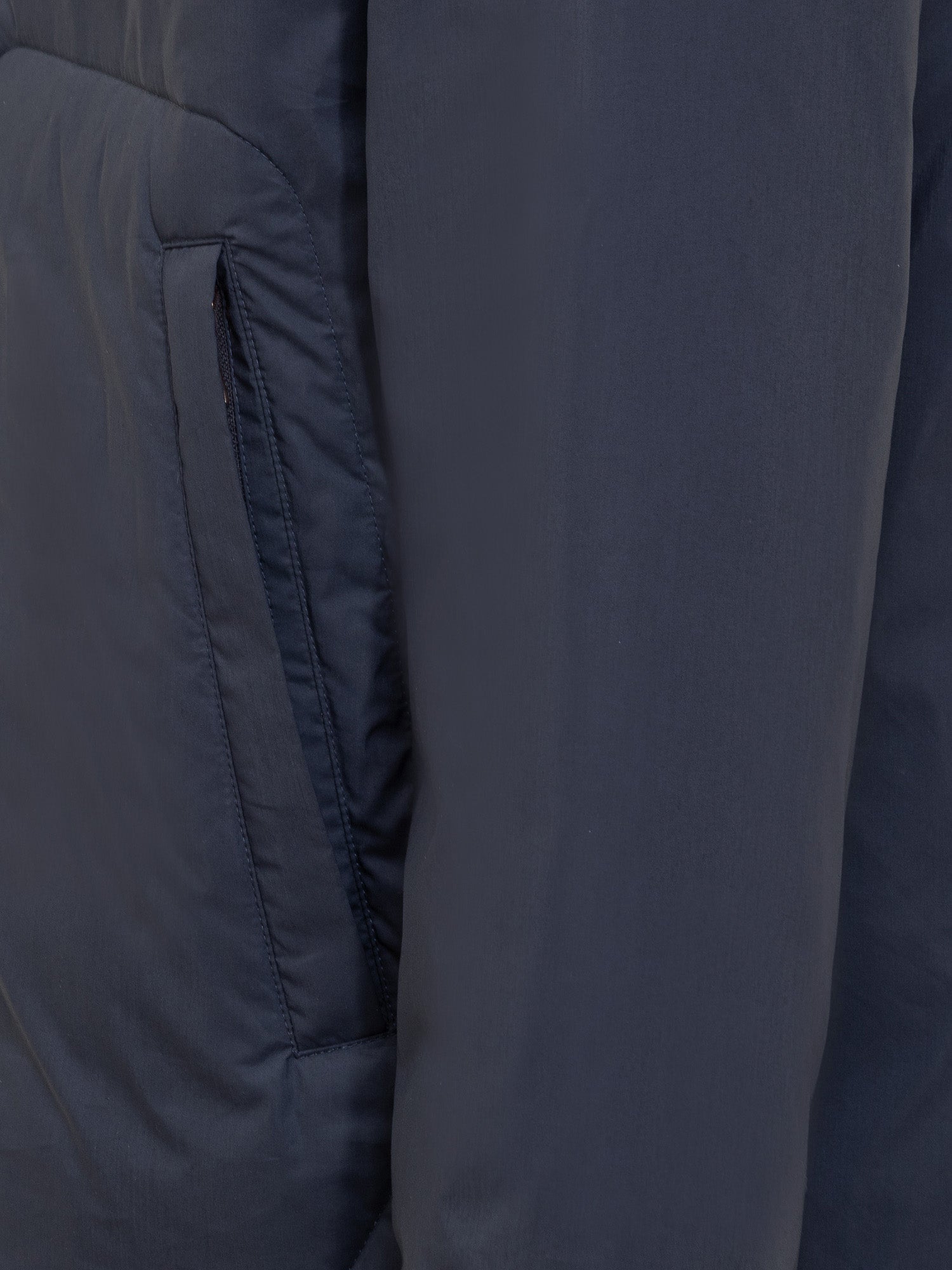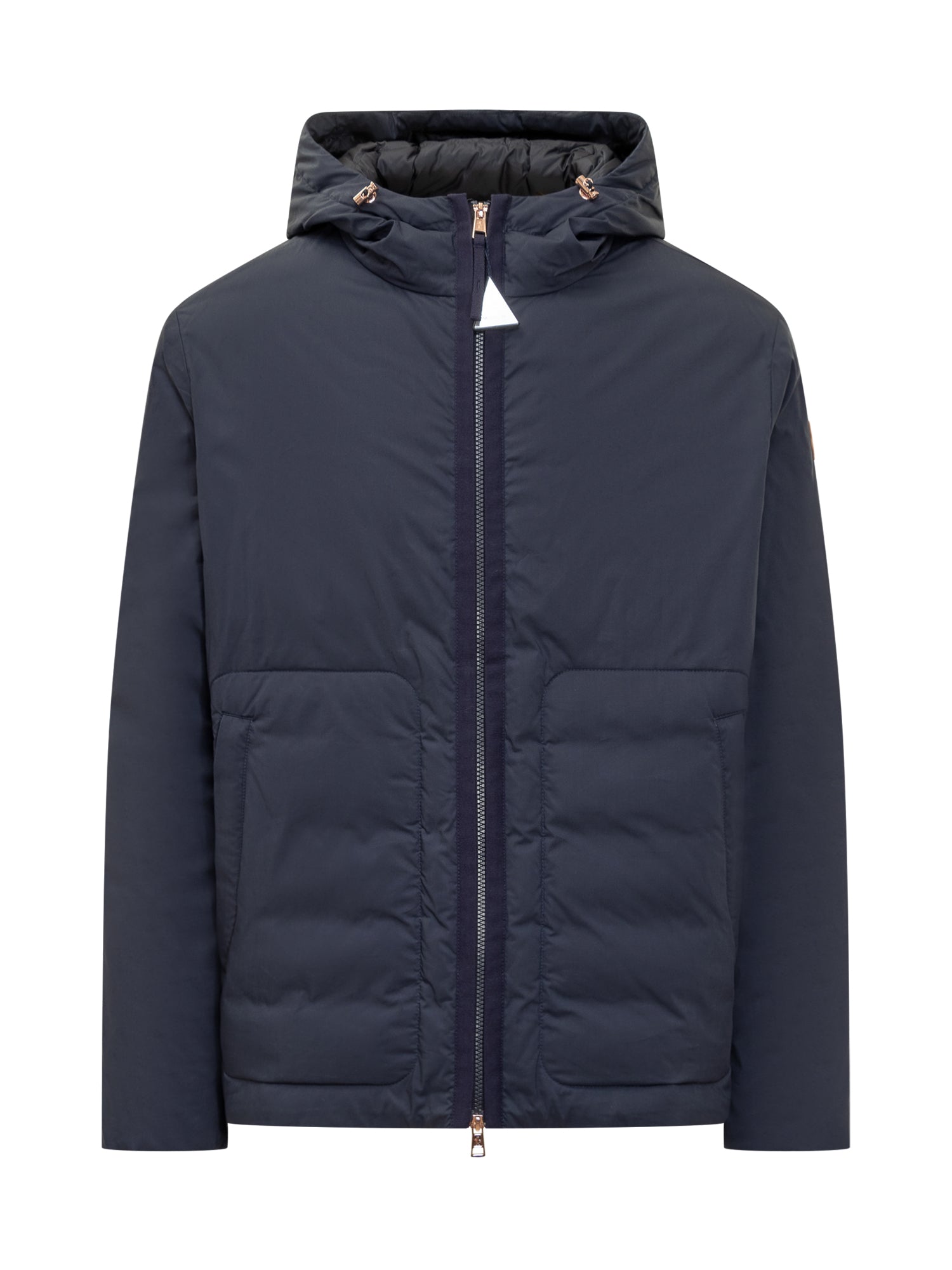 Padded jacket with hood. Hood with drawstring. Zip fastener. Stitched flap and zipped pockets. Logo patch on sleeve.