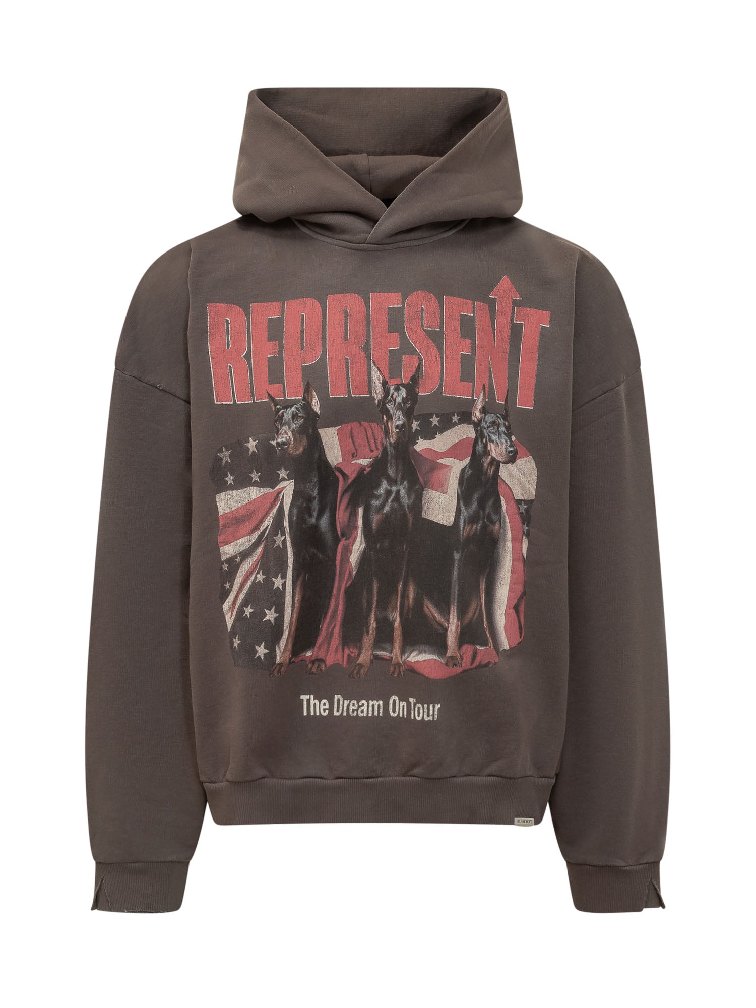 Men s relaxed-fit hoodie made from soft cotton. The design features a large front graphic print with the Represent lettering and three Dobermans over a flag background, finished with a hood, ribbed cuffs and hem for a contemporary streetwear look.
