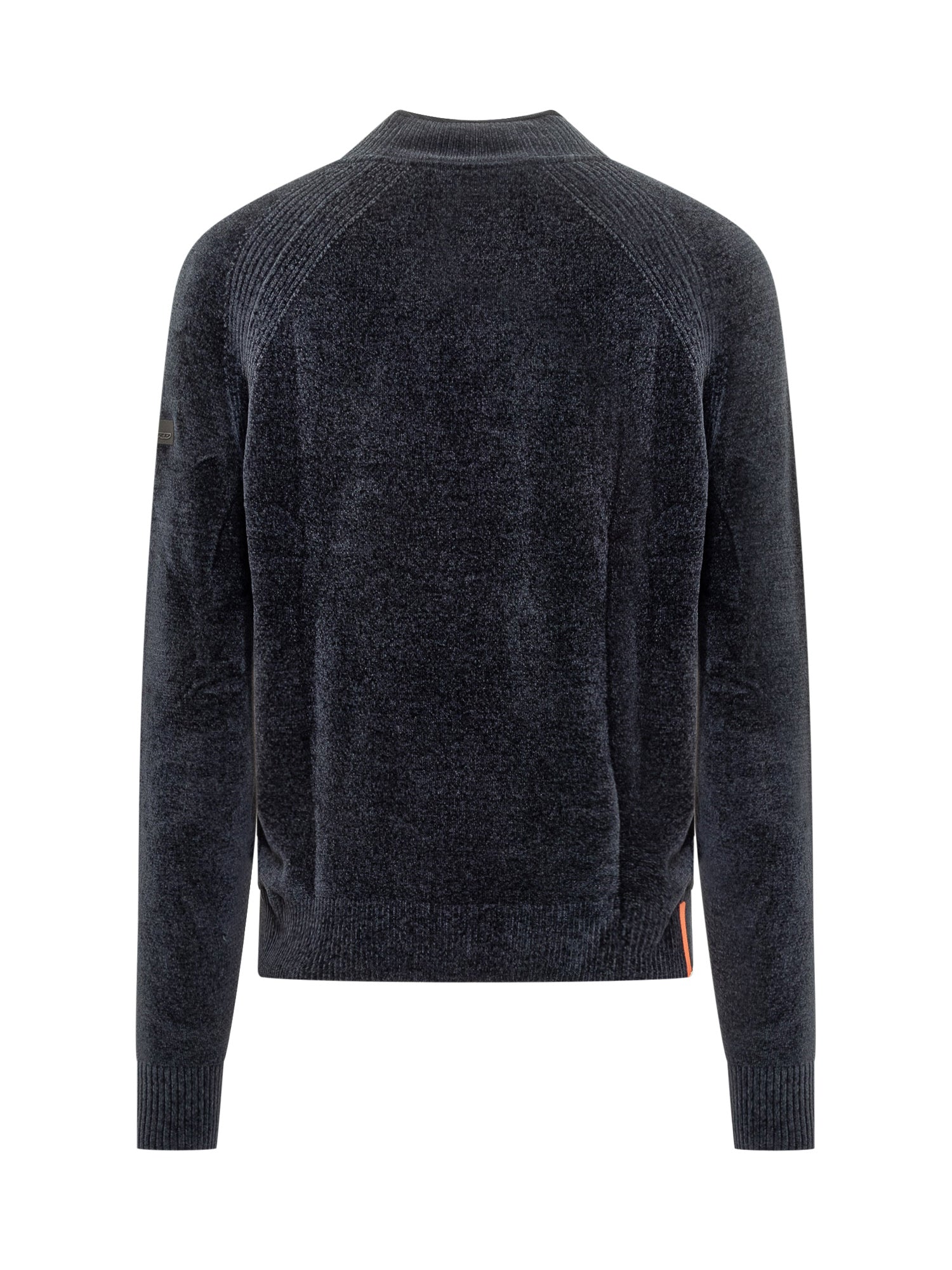 RRD blue wool sweater with velvet-touch finish and ribbed collar, shoulders, and cuffs.