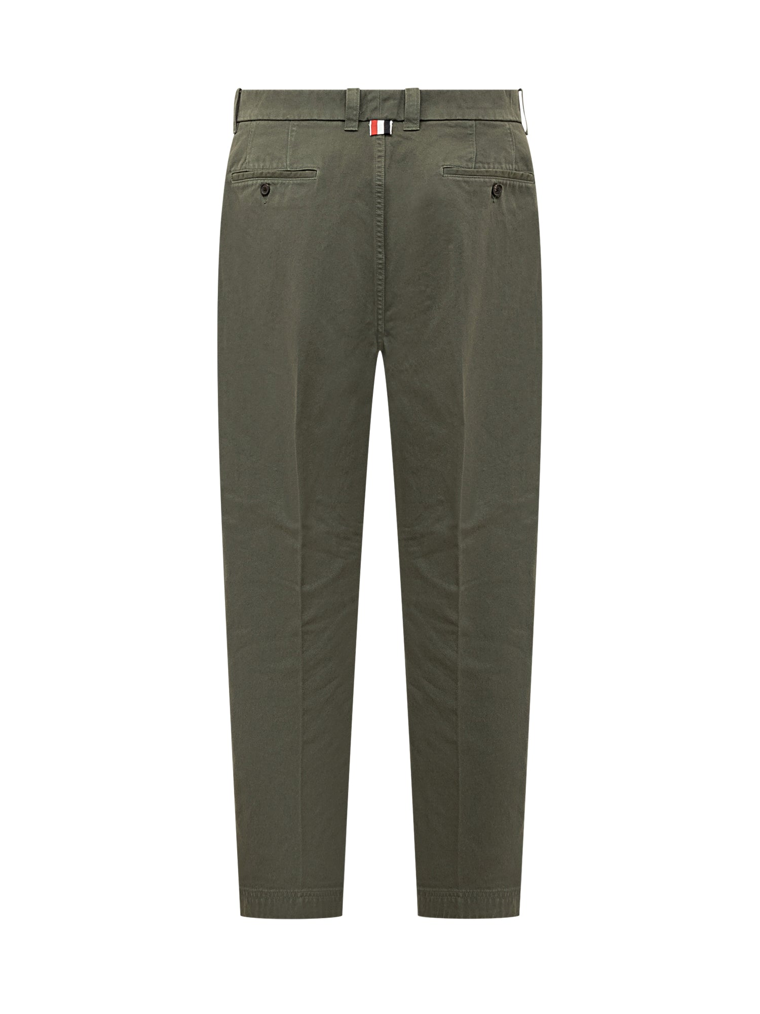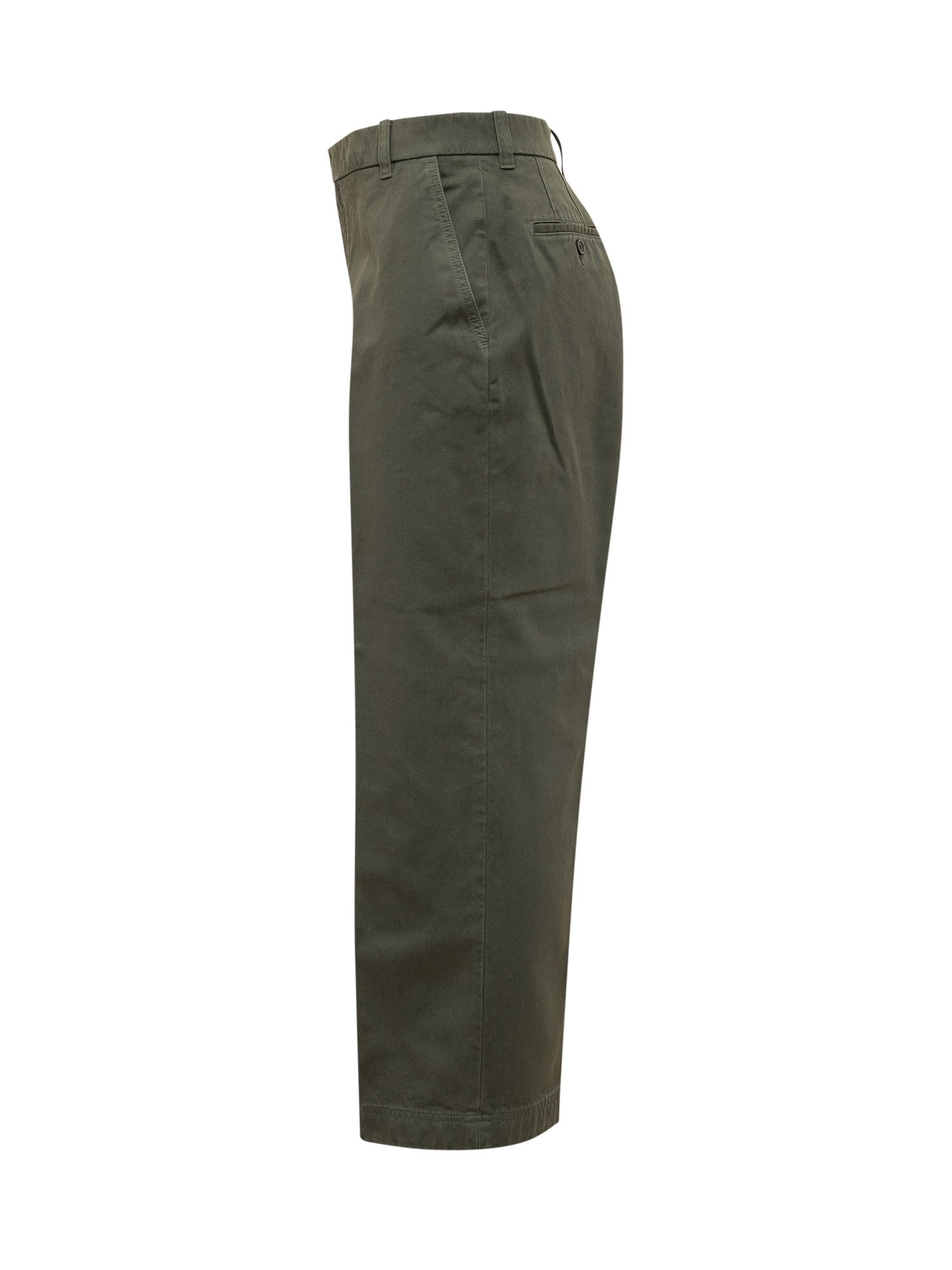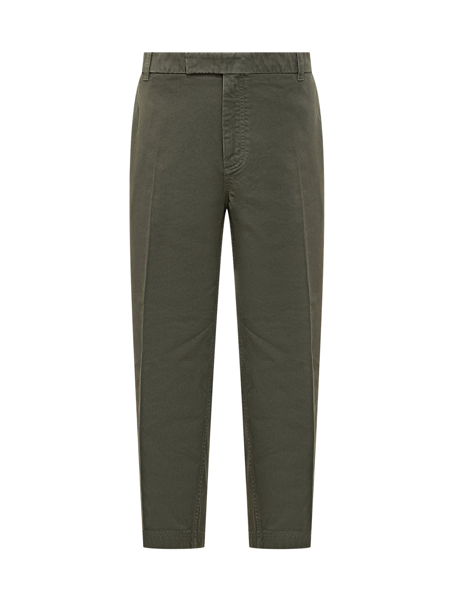 Olive green straight-leg cotton trousers with mid-rise waist, belt loops, and front crease for a clean and sophisticated style.