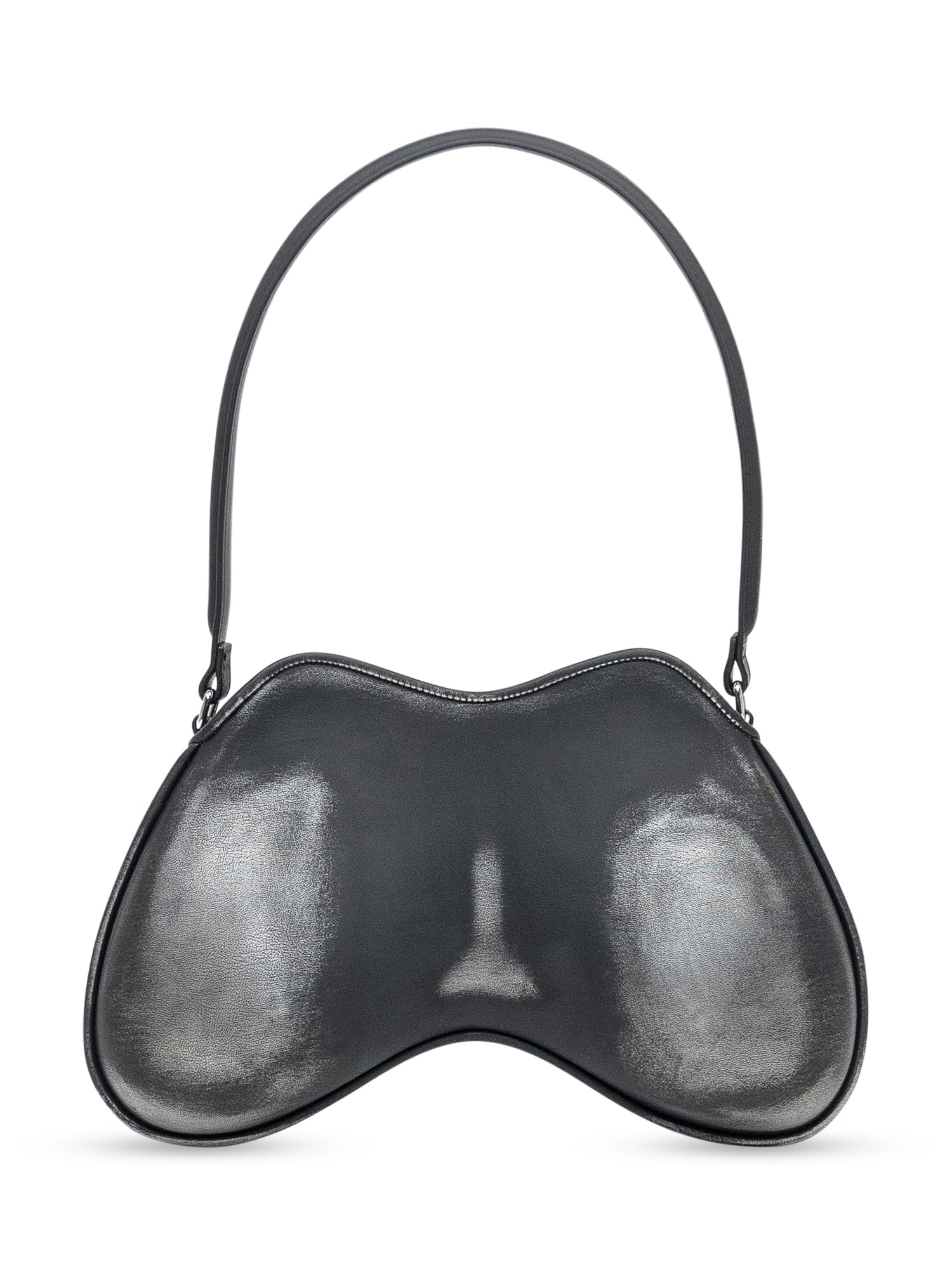Diesel Double-D shoulder bag in silver metallic leather with sculptural silhouette. Features single handle, front logo and zip closure.