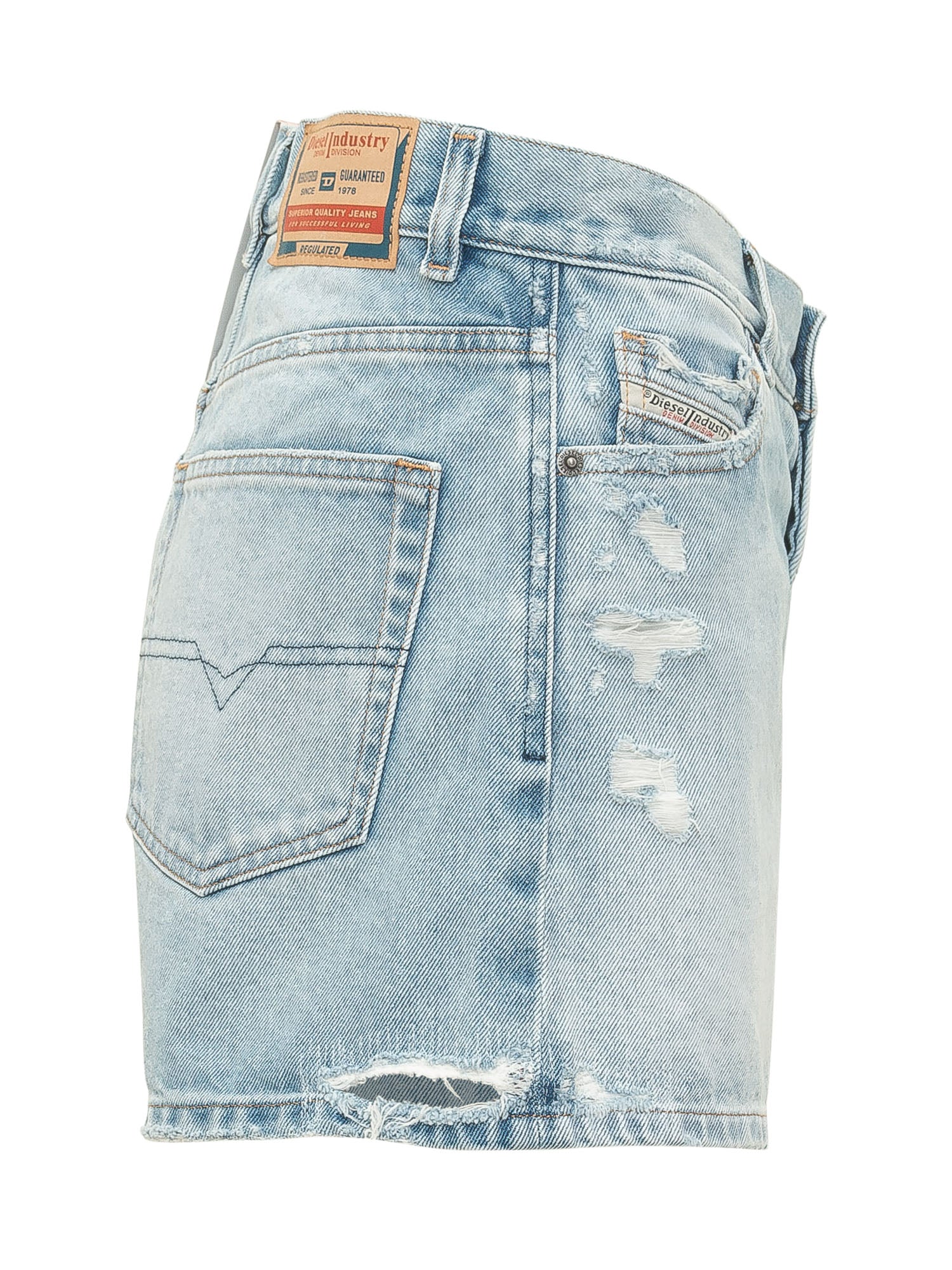 Denim shorts with front button closure and belt loops. Five pocket construction with light abrasions and straight hem. Contemporary design created for summer outfits with strong character.