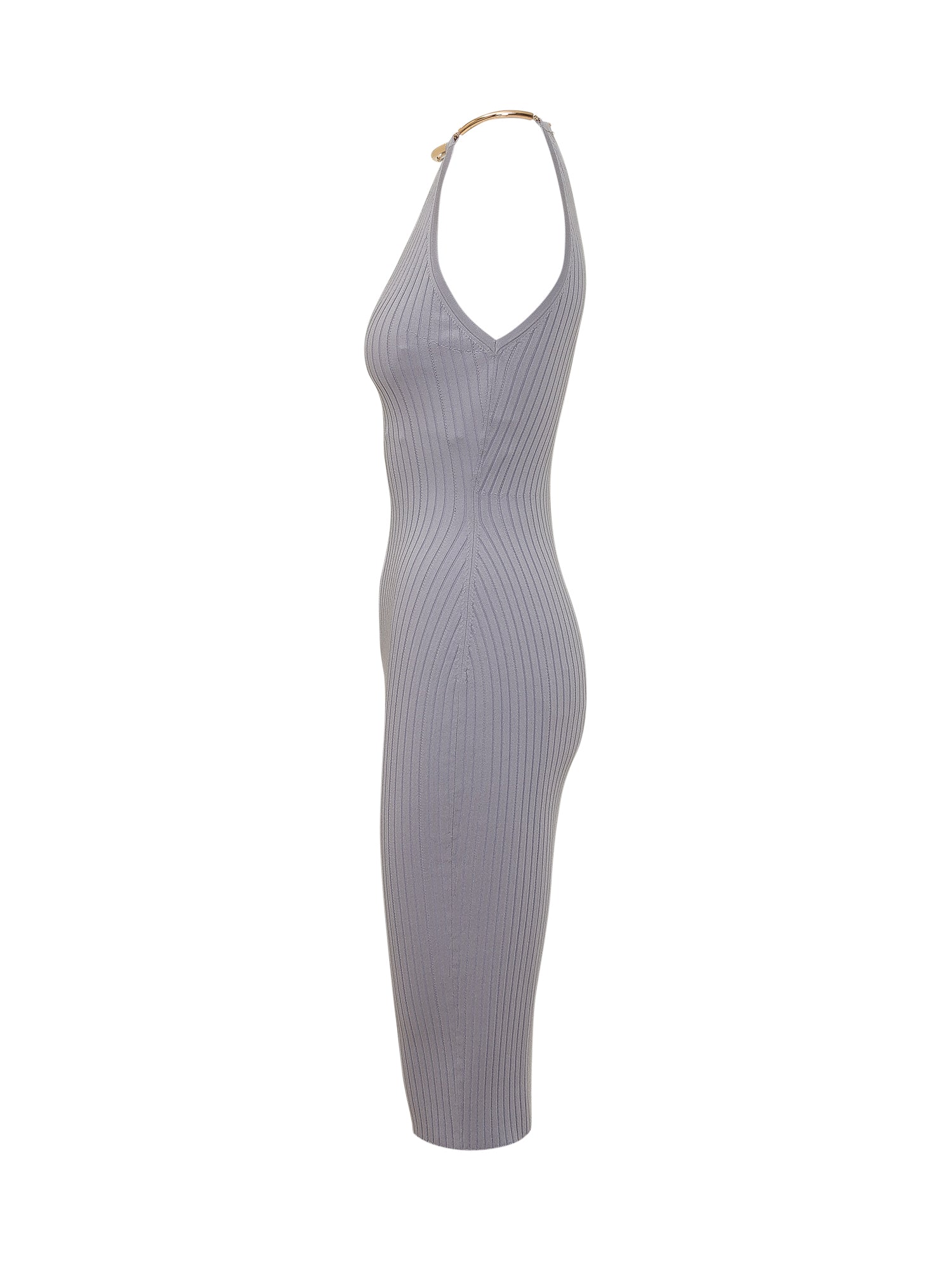 Sleeveless knit dress with V neck and fitted silhouette. Ribbed texture and midi length. Jewel detail at the neckline for a distinctive touch.