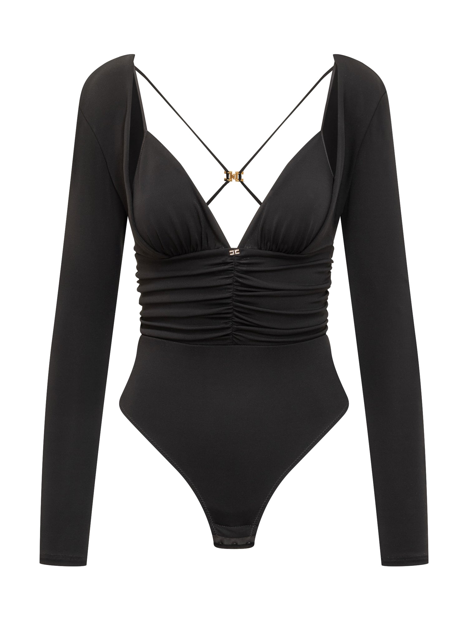 Black bodysuit by Elisabetta Franchi featuring crossed straps and gold logo detail. Fitted design with deep neckline and ruched bust.