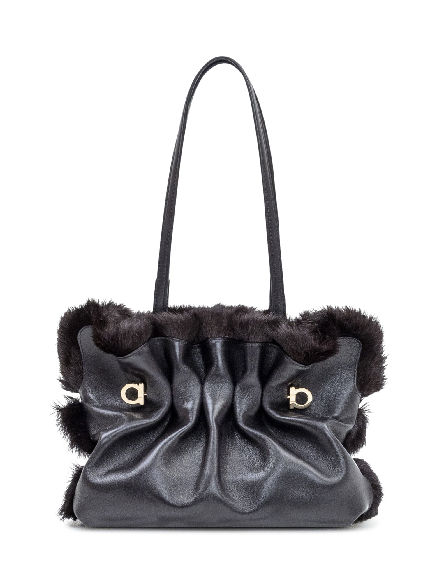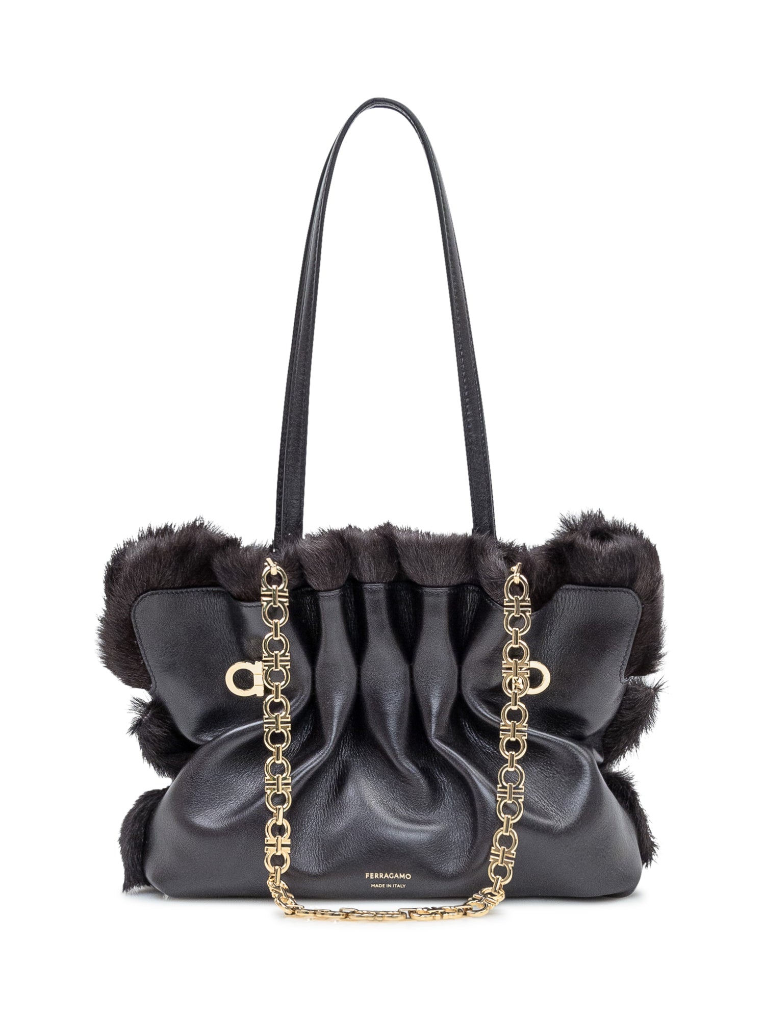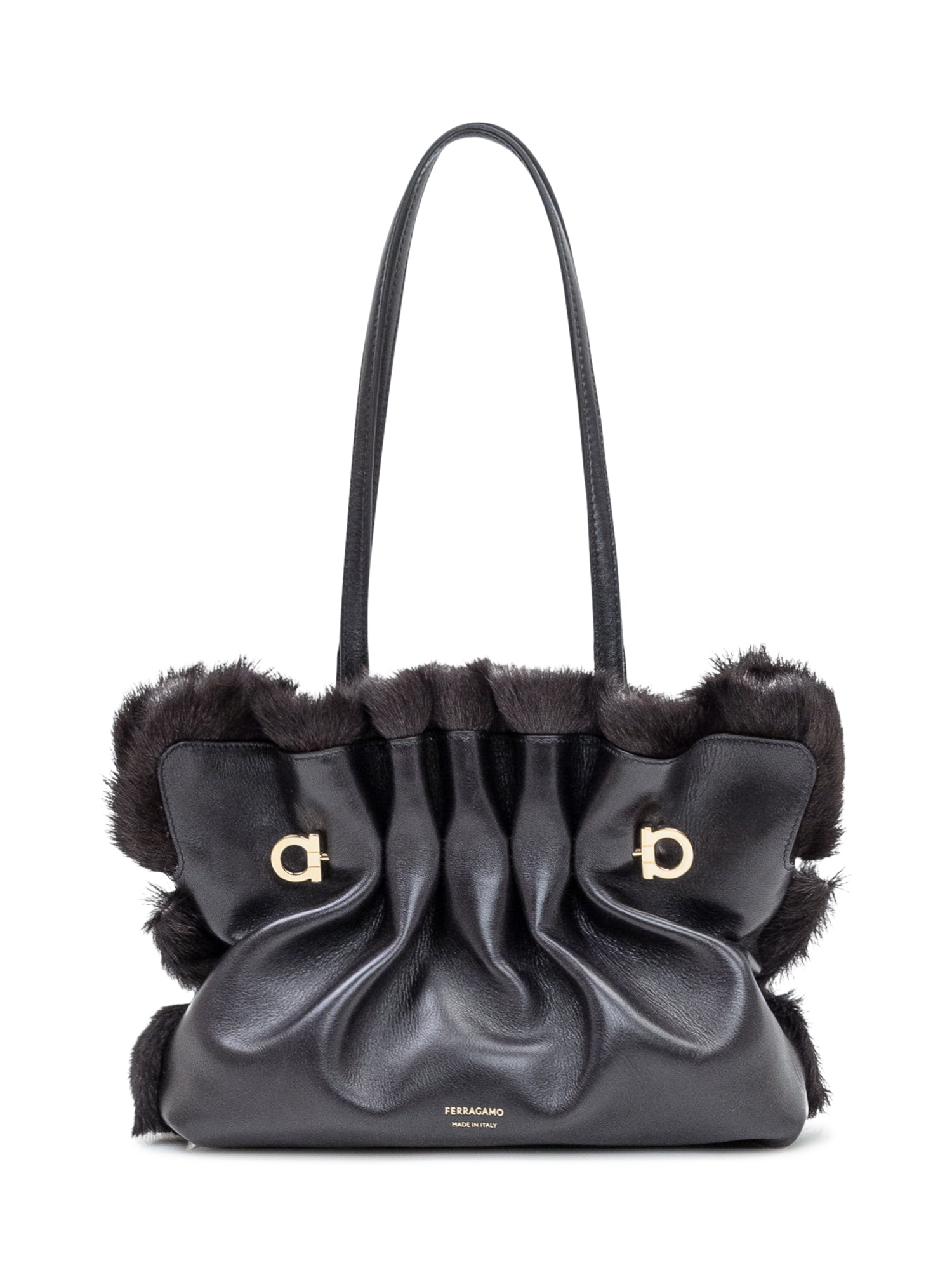 Ferragamo Soft SH bag in black leather with fur details and golden gancini logo.