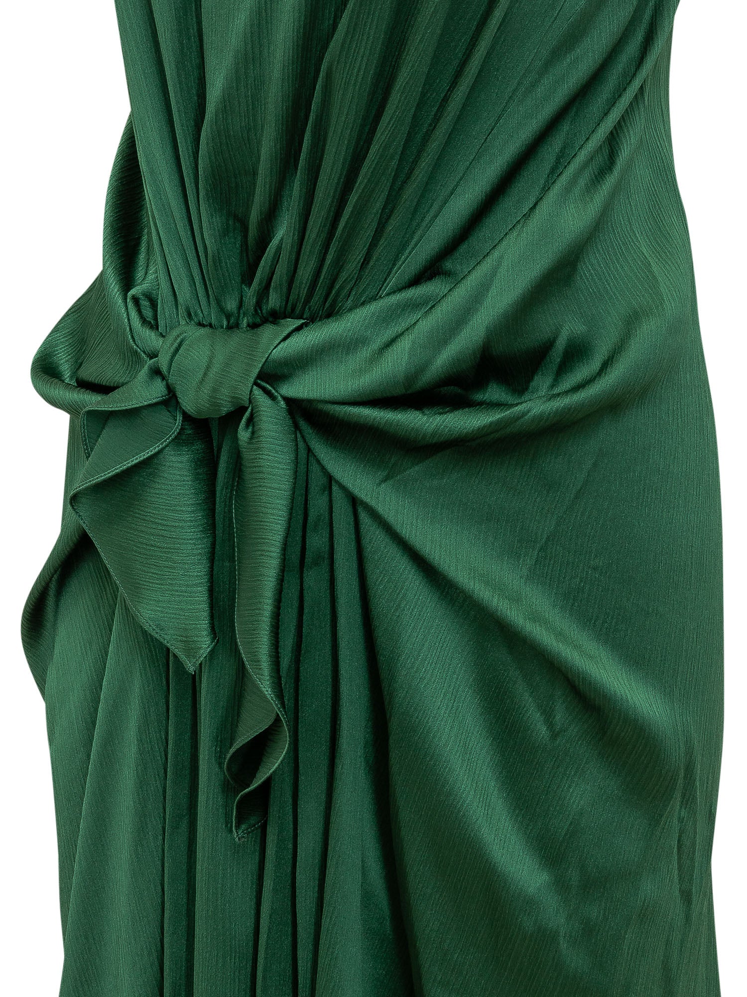 Elegant midi dress in a deep green shade, featuring a fluid and feminine silhouette. Designed with a wide neckline and slim straps, it is enhanced by soft draping across the bodice. The waist knot detail defines the shape and creates a refined wrap effect, while the skirt flows gracefully to mid-calf length. Perfect for ceremonies, summer events, or special evenings.