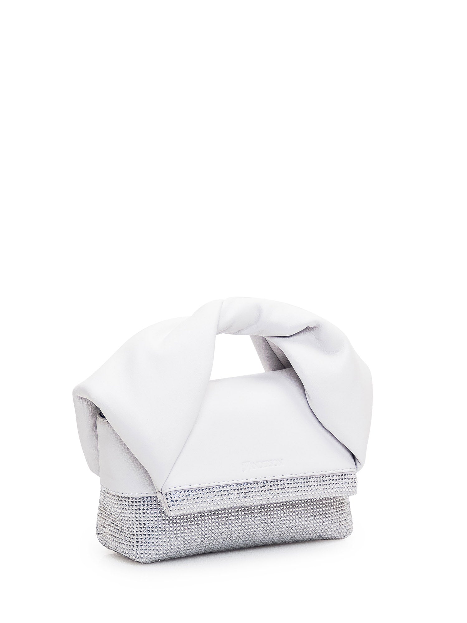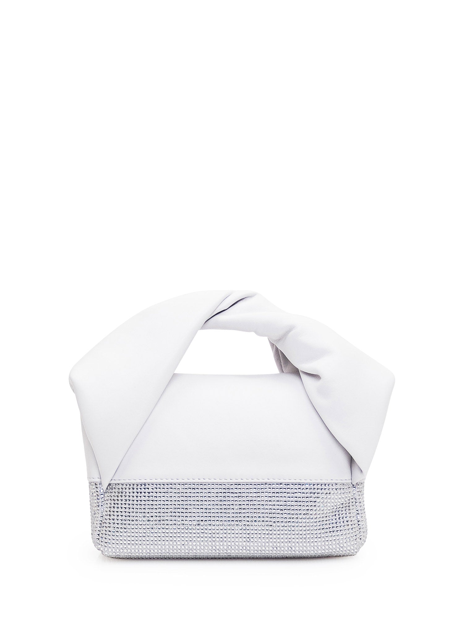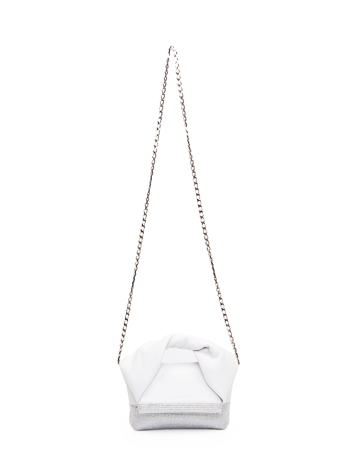 White leather handbag with rhinestones on the bottom. A leather handle. Removable chain shoulder strap. Flap closure with magnet. Logo on the front.