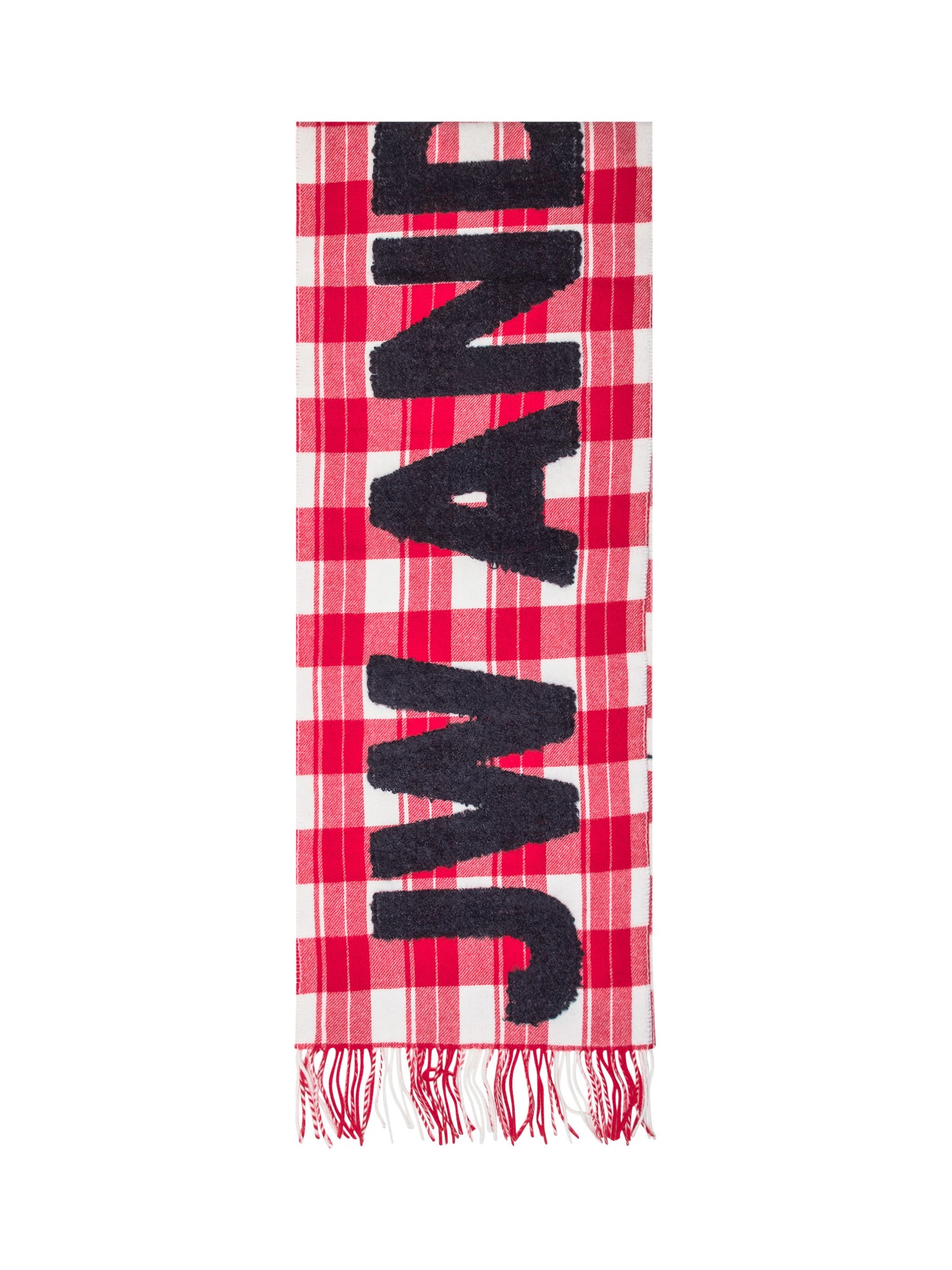 Lightweight checked scarf with oversized logo detail and fringed edges.