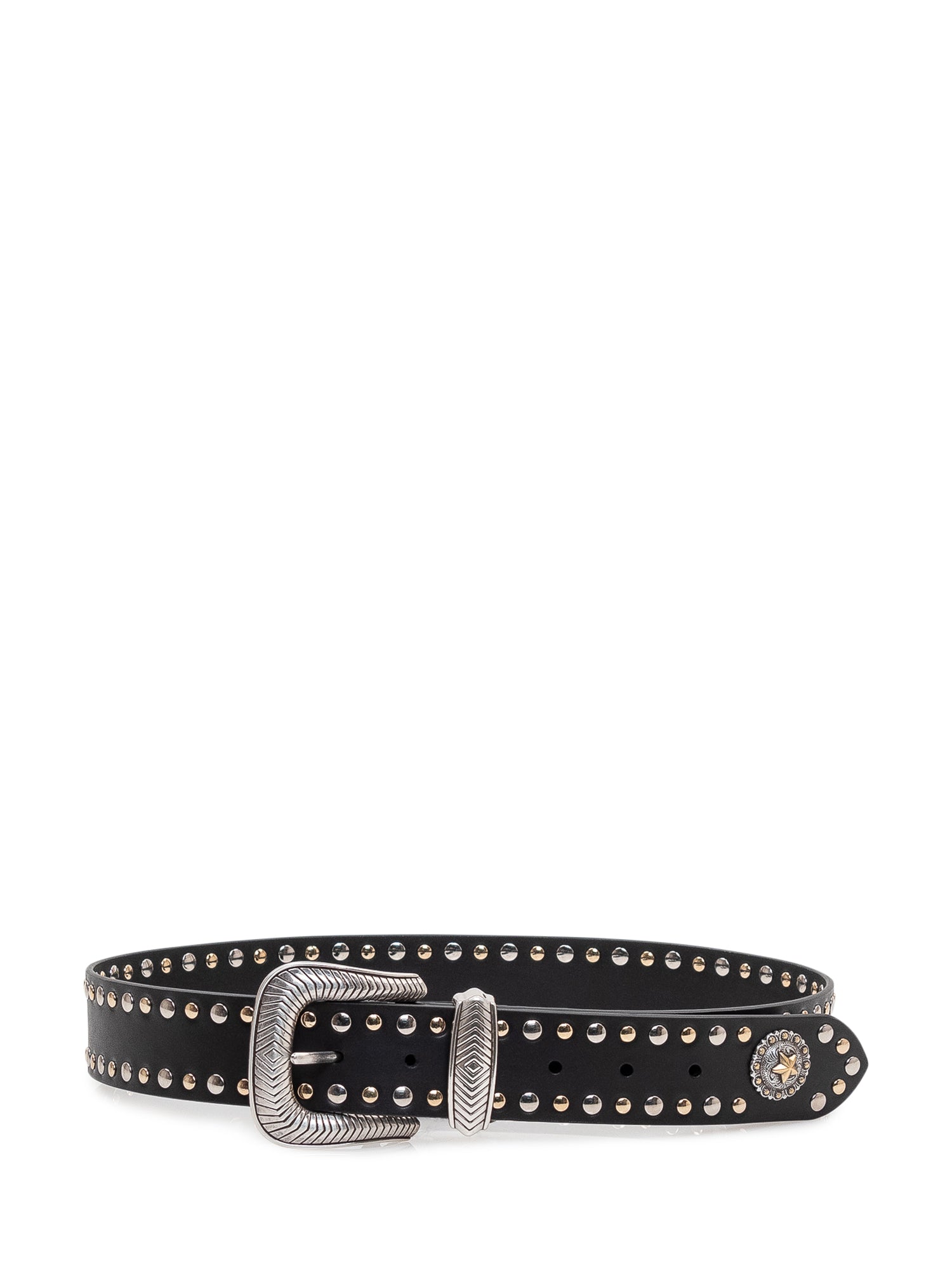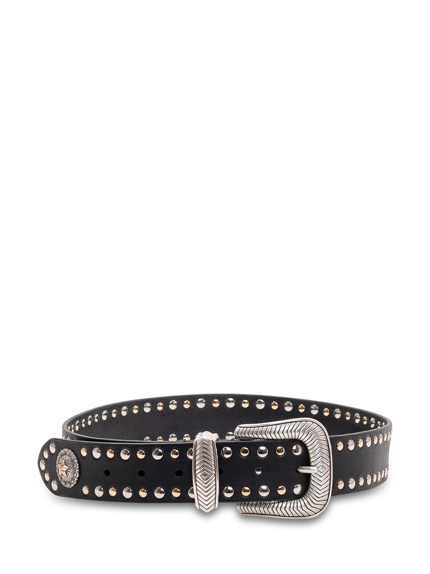 Floyd belt with decorative metal studs and engraved buckle. Structured design with matching keeper.