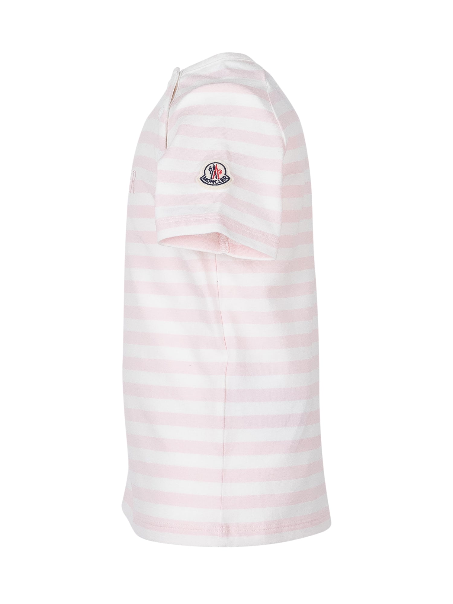 Short sleeve T-shirt with crew neck and striped pattern. Embroidered logo on the front and buttons on the shoulder.