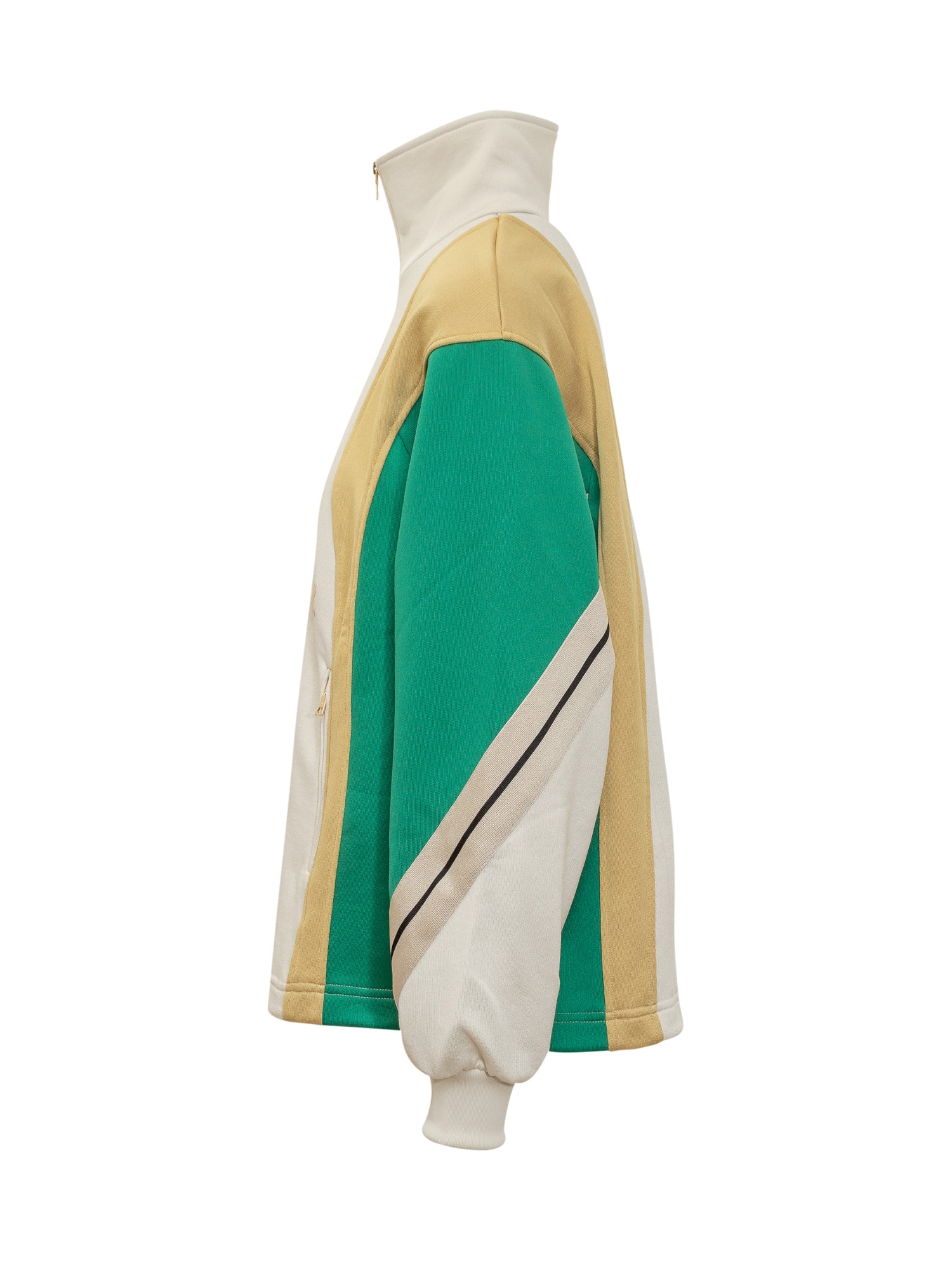 Sweatshirt with long sleeves. Stand-up collar. Ribbed hems. Zipper closure. Two zipper pockets on front. Monogram PA embroidered on front. Logo bands on sleeves. Colorblock white, green and gold.