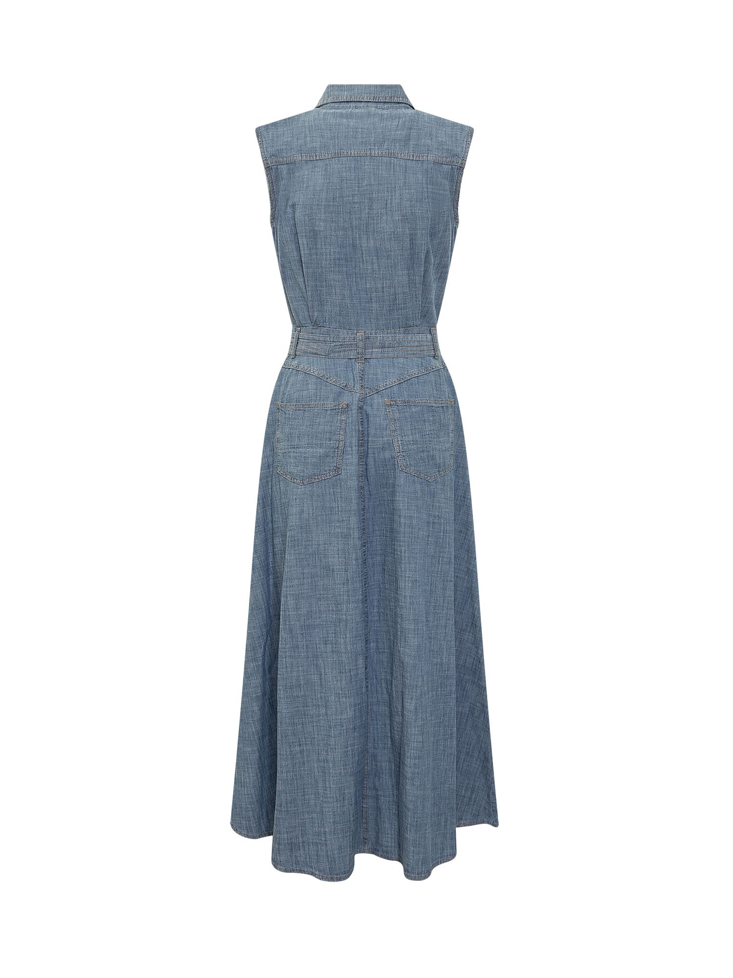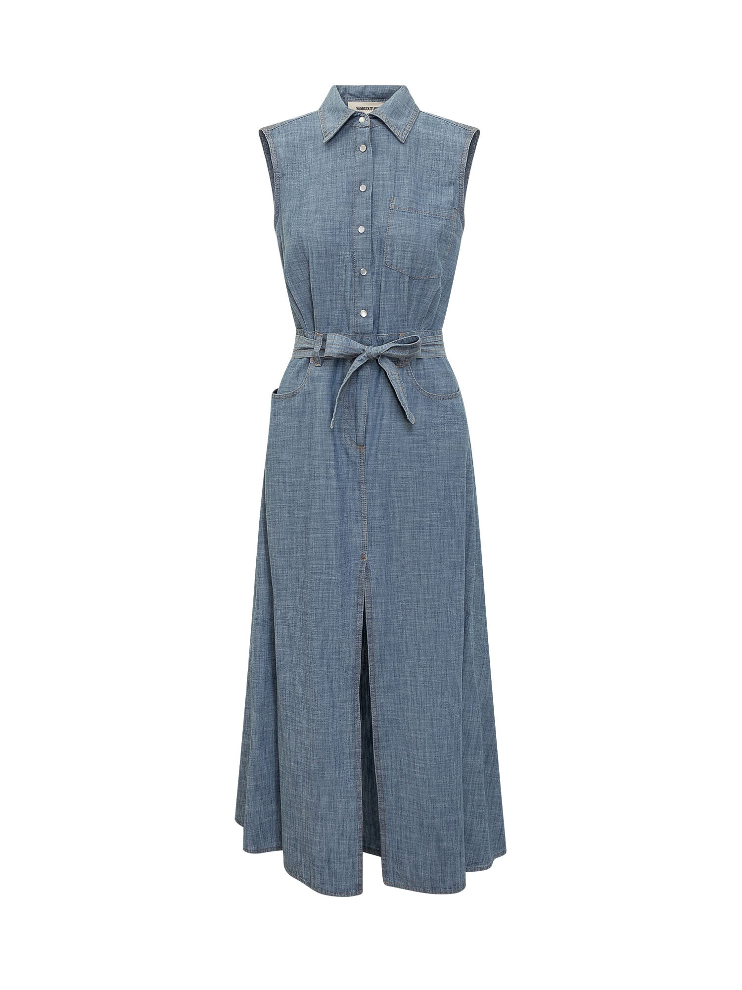 Midi sleeveless cotton dress. Classic collar. Button closure. Matching belt at the waist. Chest pocket. Five pockets. Deep slit in front.
