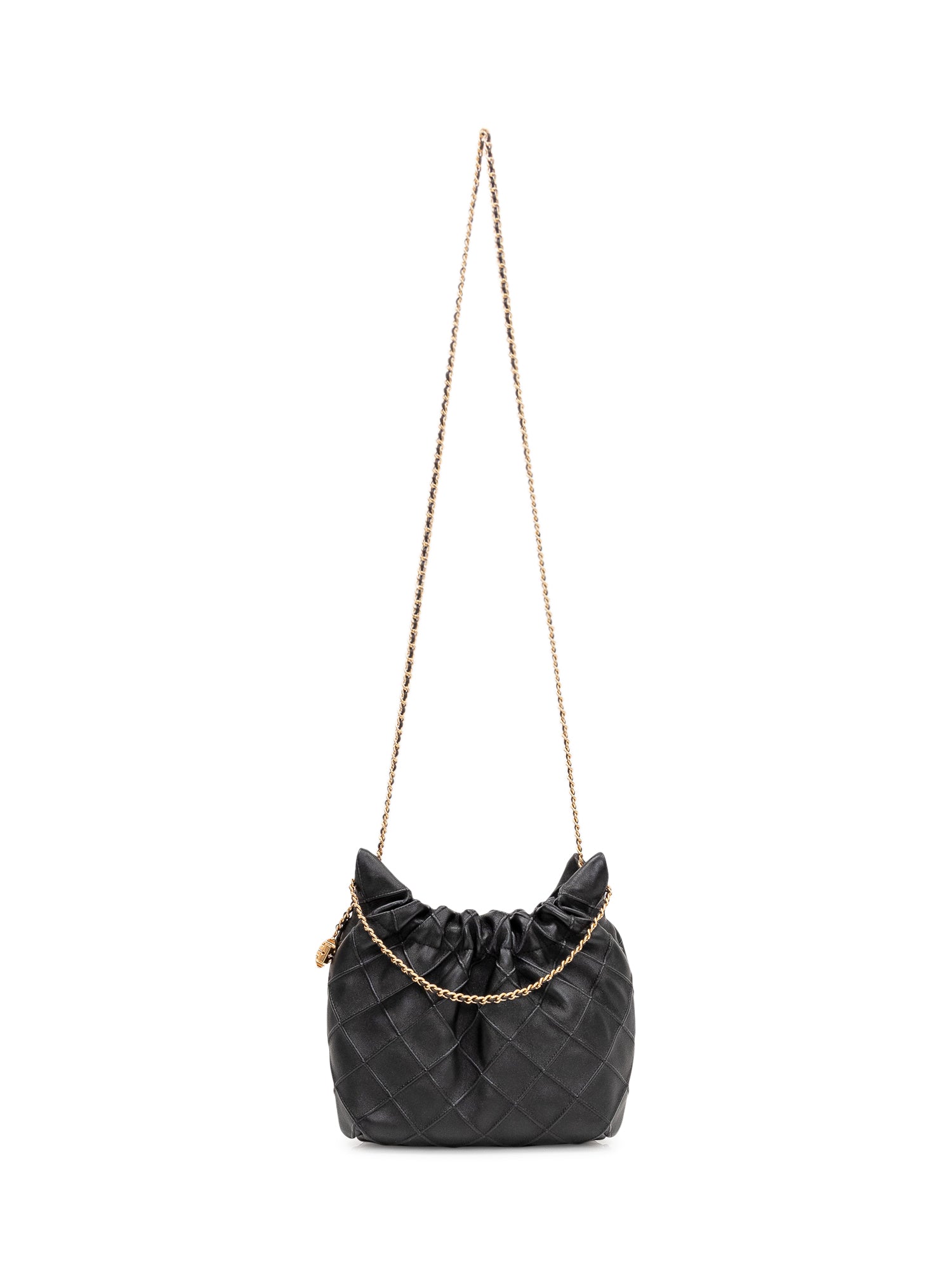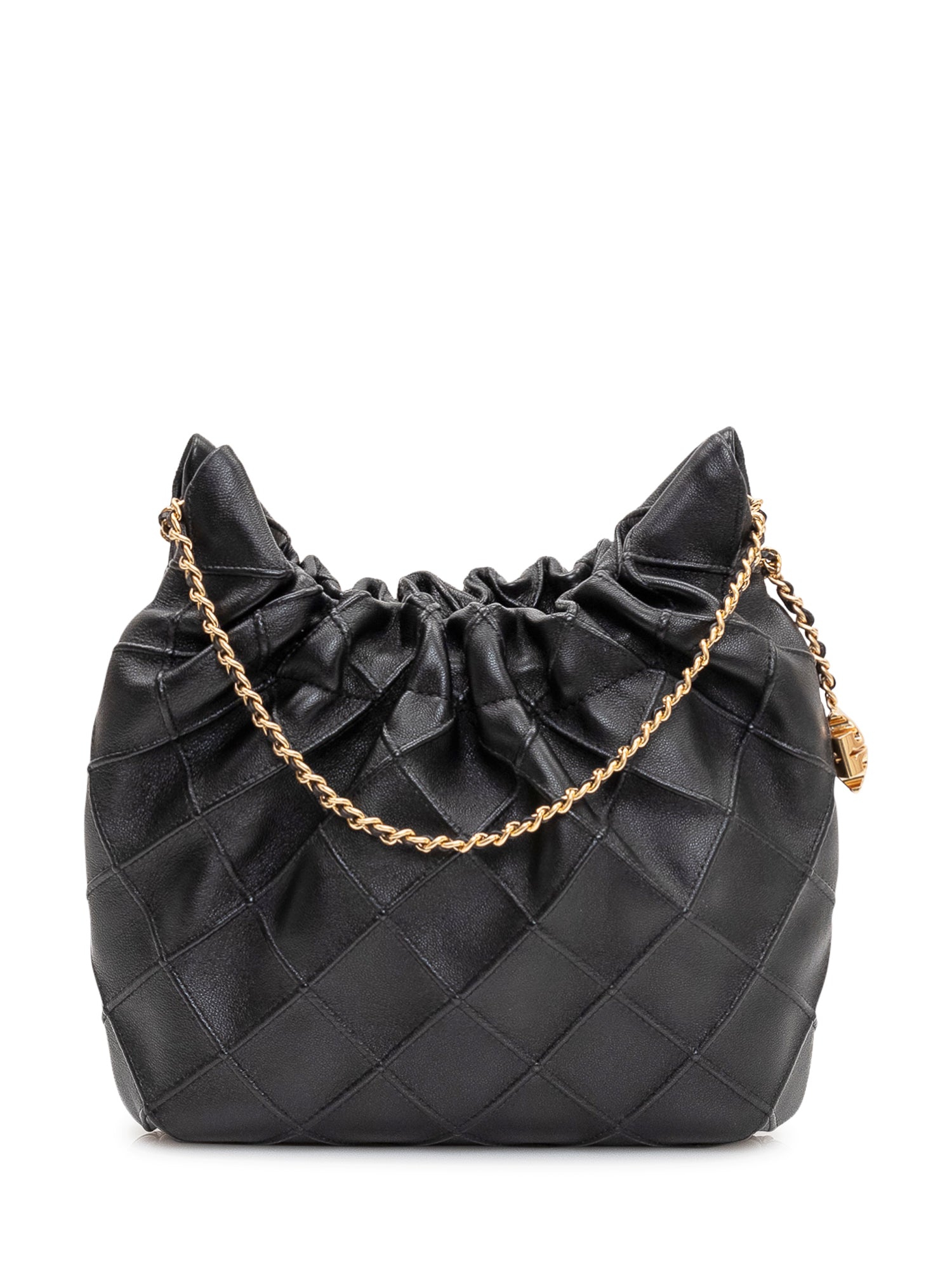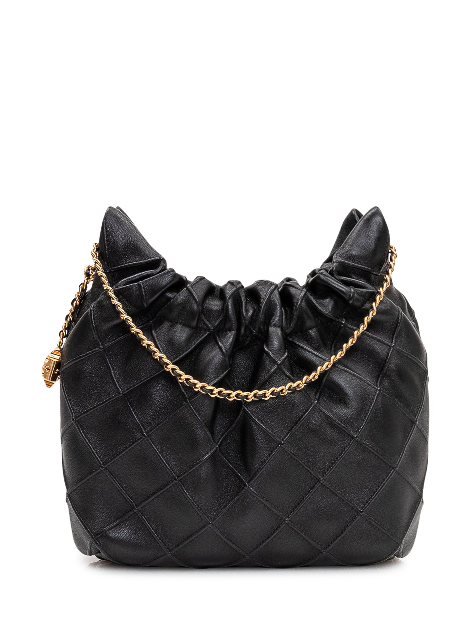 Quilted shoulder bag featuring a soft, gathered design and a chain handle for a refined finish.